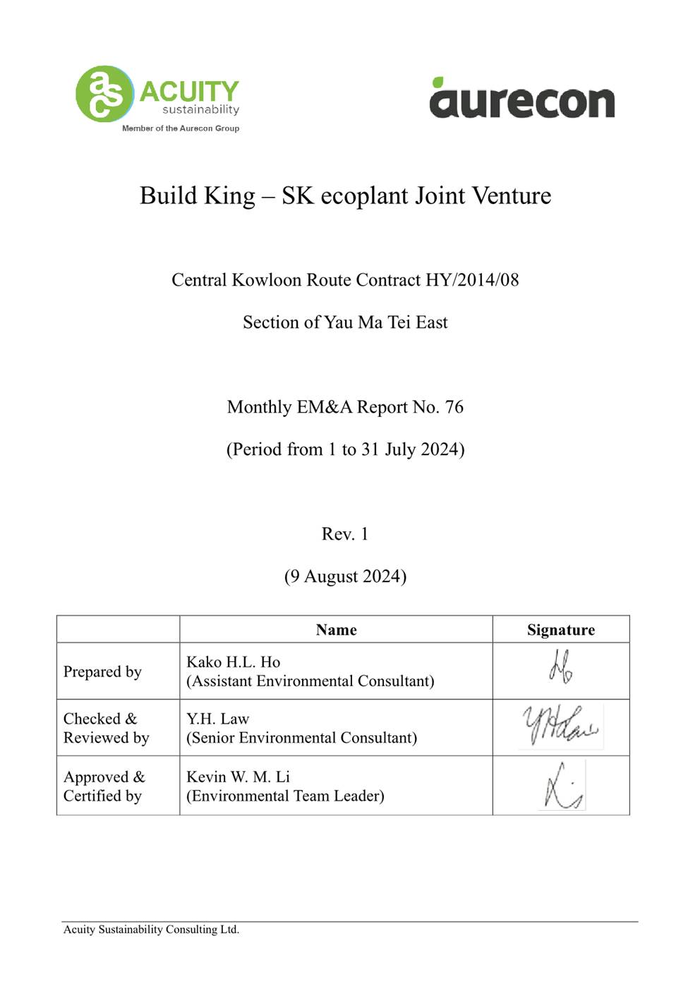 A.1 Build King – SK ecoplant Joint Venture (“Contractor”) commenced the construction works of Highway Department (HyD) Central Kowloon Route Contract No. HY/2014/08 – Section of Yau Ma Tei East (“The Project”) on 20 April 2018. This is the 76th monthly Environmental Monitoring and Audit (EM&A) report presenting the EM&A works carried out during the period from 1 July 2024 to 31 July 2024.