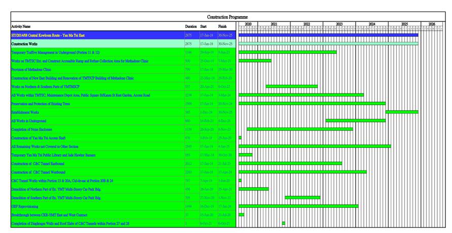 · Construct Roof Slab/Lintel Beam, excavate soil below roof slab and install ELS L7 & L8 at Zone E (Access Shaft) · Rock excavation down at Zone E (Access Shaft) · Install 406mm pipe piles at Yau Ma Tei Police Station (YMTPS) · Architectural Builders Works and Finishes (ABWF) and Building Services (BS) Works including Lift Installation and T&C Works at Temporary Public Library Cum Jade Hawker Bazaar Building (TPLCJHB) · Excavation below Ceiling Slab to Formation Level at Zone A · Construction of Stage 1 D-wall panels at Zone B · Construction of Stage 1 D-wall panels at Zone C |