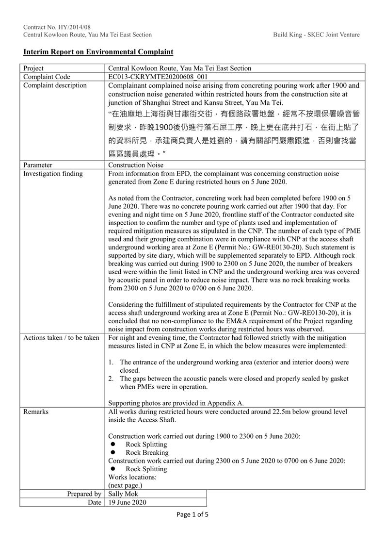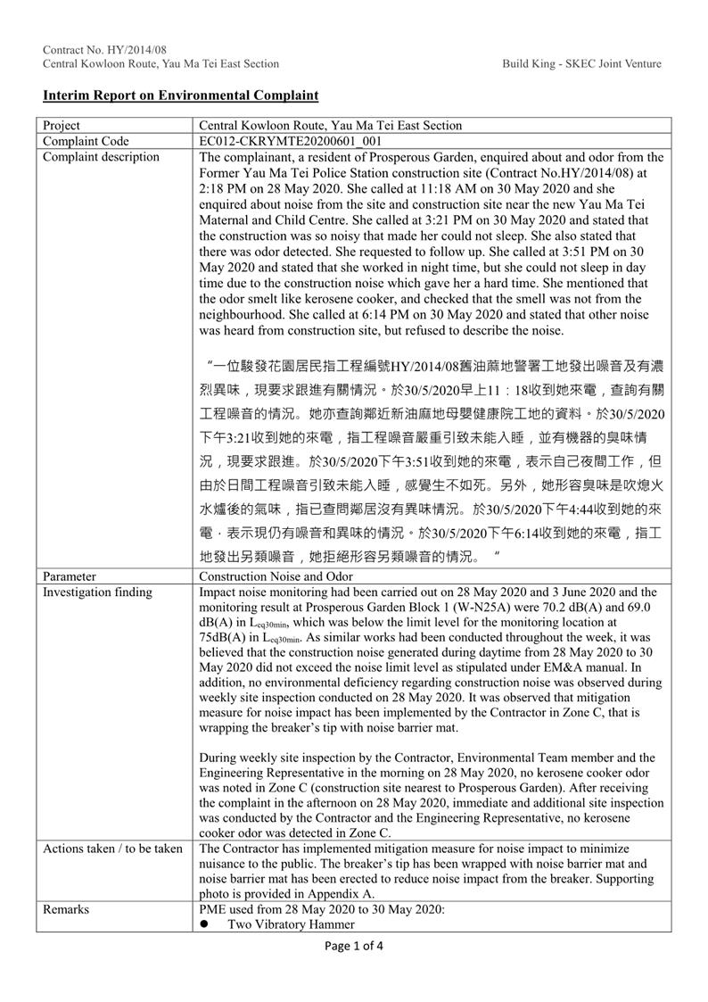 A.8 Two noise-related complaints were received in the reporting month on 1 June 2020 and 8 June 2020. One odour-related complaint was received on 1 June 2020. After investigation with Contractor and conclusion, precautionary measures have been proposed to the Contractor by ET. The interim reports for the complaints are shown in Appendix Q.