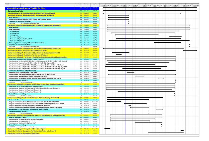 · Pre-drilling Works at Portion 1B, 1D, 1E and 1F · Tree Felling at Portion 1B and 1E · Socket H-pile at Portion 1B, 1E, 1F and 1G · Excavation and Lateral Support (ELS) and Excavation for Vent Adit Construction Ch 0-60 at Portion 9 · Pipe Pile at D-wall and Vent Adit (Ch-250~280) at Portion 1D, 1F and 10 · King Post at D-wall Area at Portion 1F · Jacking Pit Construction of Sewerage System at Portion 1B · Watermain Installation at new pipe sleeve (pipe jacking) at Portion 1B · ELS and Excavation Works for Pile Cap Construction at Bridge G (GP1, GP2, GP3 & Abutment G) at Portion 1B · Pipe Cap and pier Construction at Bridge G including Abutment G at Portion 1B · ELS and Excavation Works at Bridge B2/C2 (C2P1, C2P2 and B2P1) at Portion 1E · Pipe Cap and pier Construction at Bridge B2/C2 (C2P1, C2P2 an B2P1) at Portion 1E |