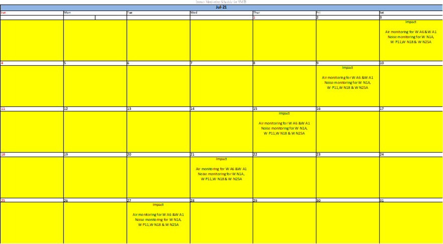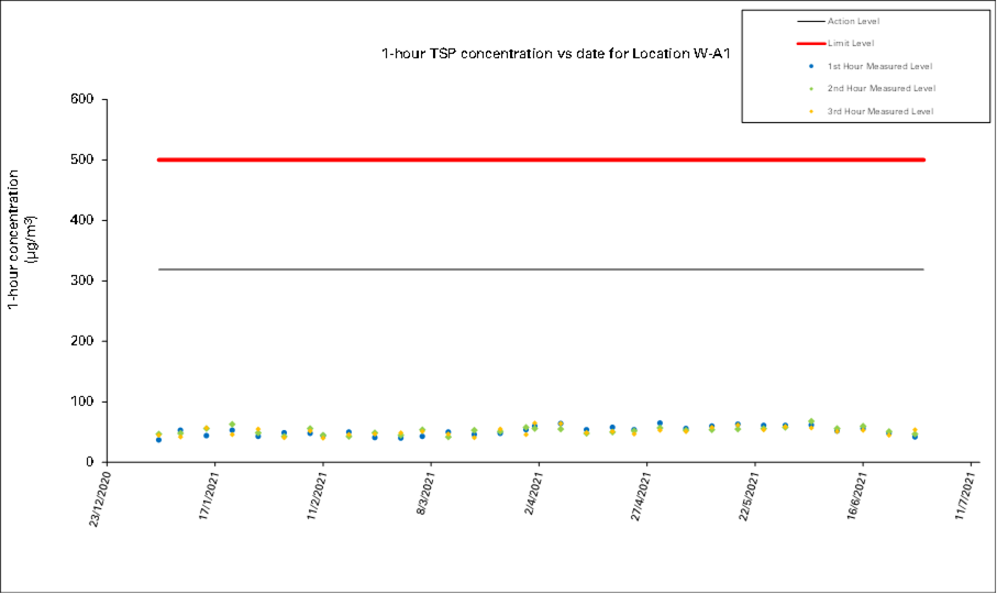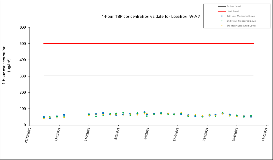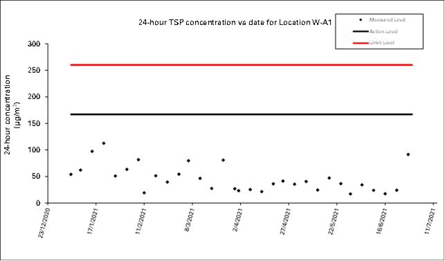 A.7 Due to the electricity supply failure for the high volume sampler (HVS) on 22 June 2021 at Man Cheong Building (W-A6), 24-hour TSP result was voided. Inspection and repair works for the electricity supply were conducted by the Contractor on 24 June 2021. Additional monitoring for 24-hour TSP at W-A6 was arranged on 25 June 2021. The result was valid and used as a substitute for the voided monitoring result on 22 June 2021.