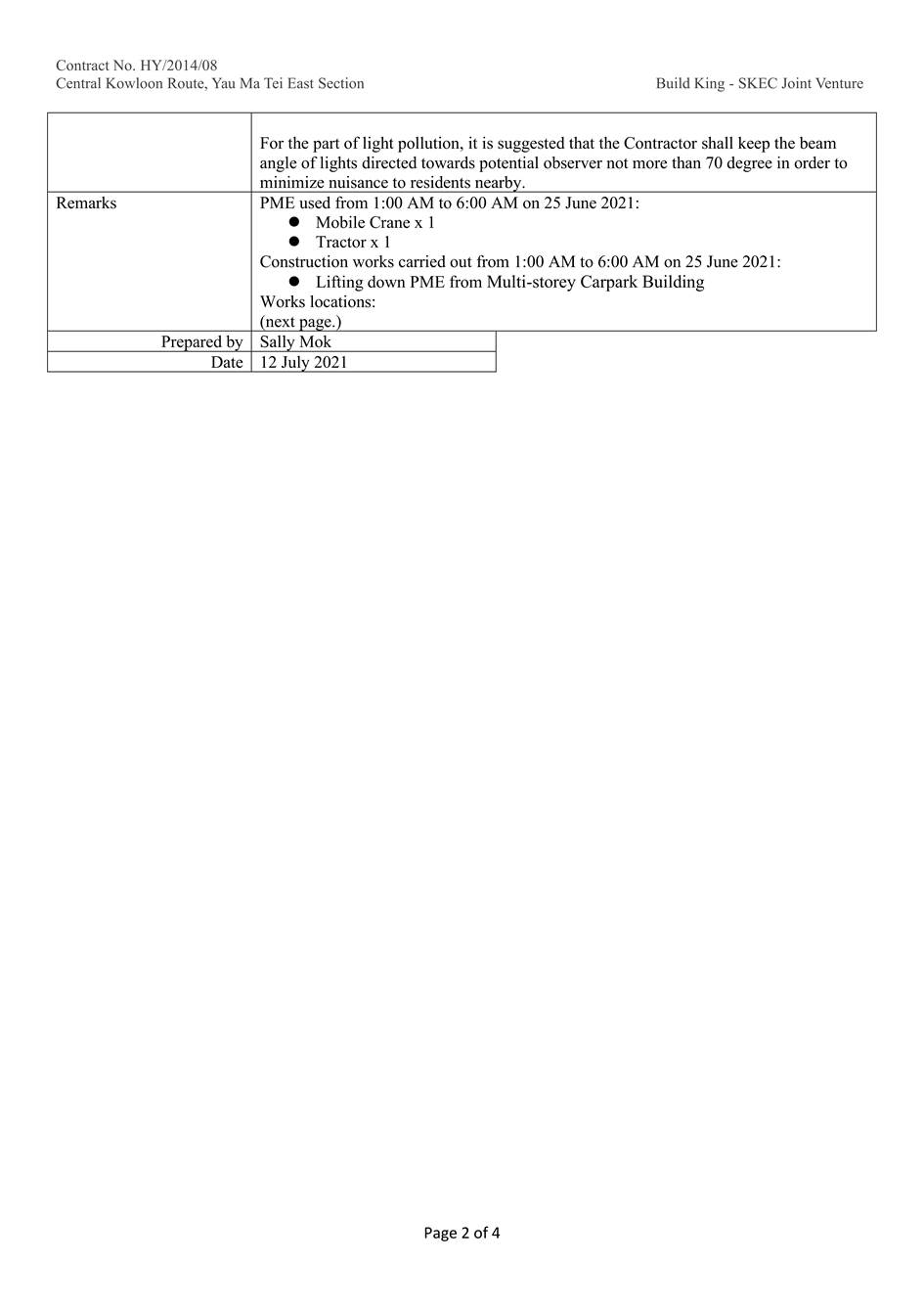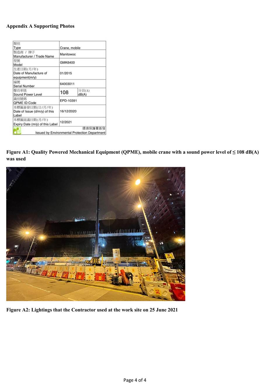 A.9 One noise-related and light pollution-related complaint was received on 29 June 2021. After investigation with Contractor, precautionary measures had been proposed to the Contractor by ET. The interim report for the complaint is shown in Appendix Q.