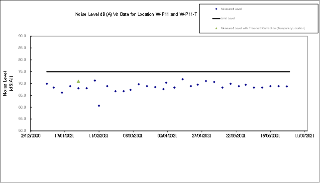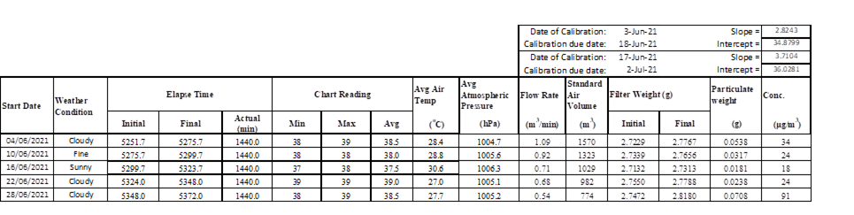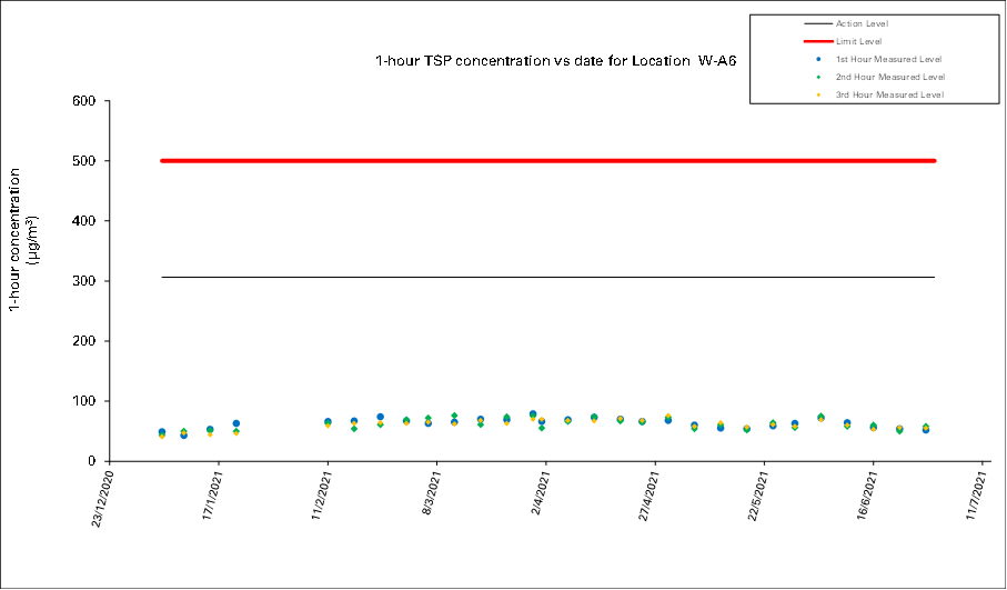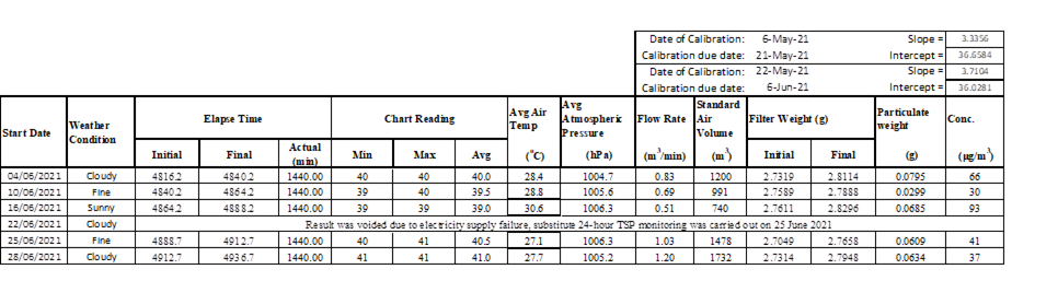 A.7 Due to the electricity supply failure for the high volume sampler (HVS) on 22 June 2021 at Man Cheong Building (W-A6), 24-hour TSP result was voided. Inspection and repair works for the electricity supply were conducted by the Contractor on 24 June 2021. Additional monitoring for 24-hour TSP at W-A6 was arranged on 25 June 2021. The result was valid and used as a substitute for the voided monitoring result on 22 June 2021.