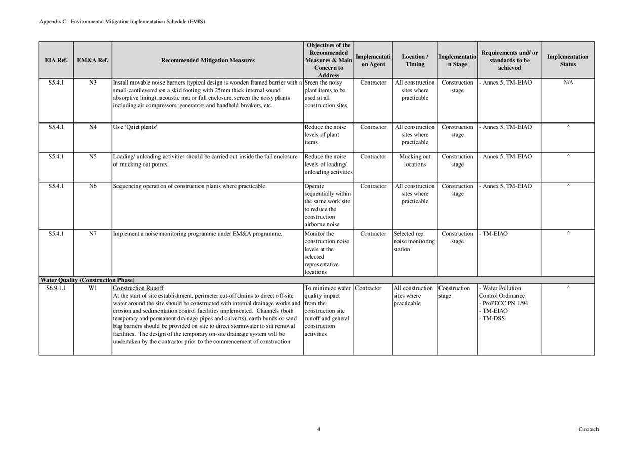 6.3 According to Environmental Permit, the approved EIA Report (Register No.: AEIAR-171/2013), and the EM&A Manual of the Project, the mitigation measures detailed in the documents are recommended to be implemented during the construction phase. An Environmental Mitigation Implementation Schedule (EMIS) is provided in Appendix C.