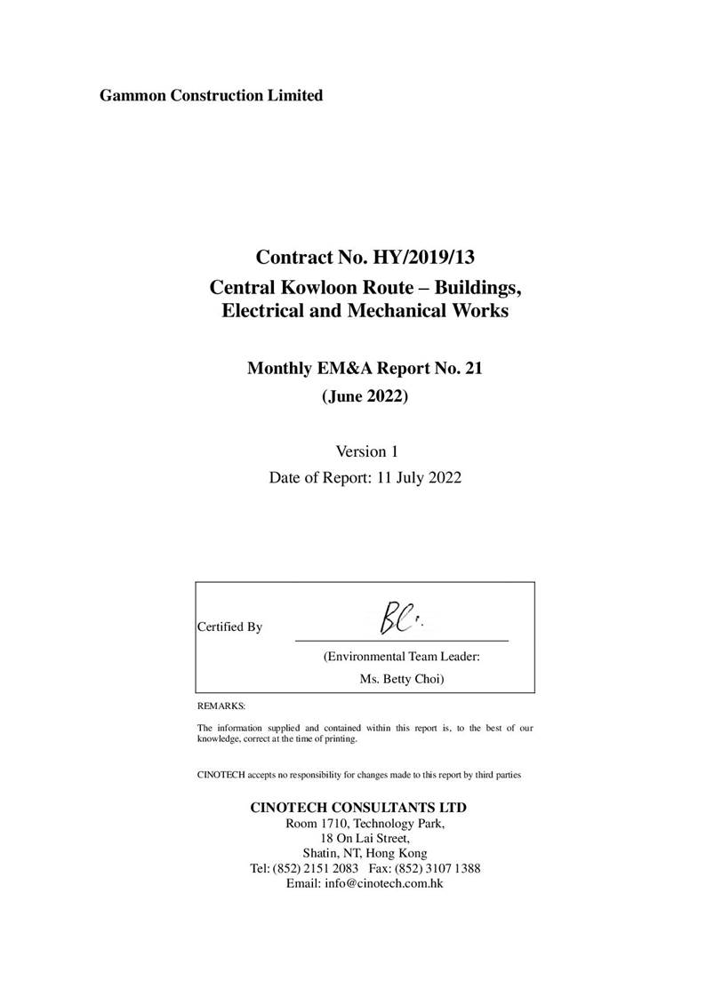 A.1 Build King – SK ecoplant Joint Venture (“Contractor”) commenced the construction works of Highway Department (HyD) Central Kowloon Route Contract No. HY/2014/20 – Section of Yau Ma Tei West (“The Project”) on 12 February 2019. This is the 41st monthly Environmental Monitoring and Audit (EM&A) report presenting the EM&A works carried out during the period from 1 June 2022 to 30 June 2022.