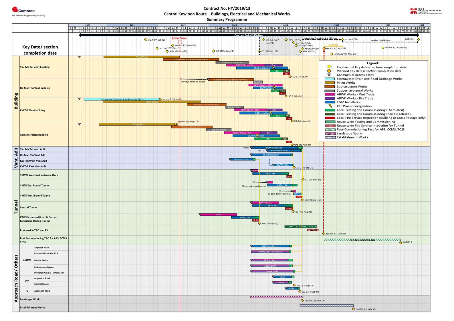 · Pre-drilling Works at Portion 1B, 1D, 1E and 1F · Socket H-pile at Portion 1B, 1D, 1E, 1F and 1G · Construction of Vent. Adit Ch 90~130 (Zone 3) · Construction of Noise Barrier C02, C03 & S01 (along Lin Cheung Road) at Portion 1E · Bridge Deck Construction at Bridge C2 Deck 2 and Bridge B2 Deck 1 at Portion 1E · Pile Cap C2P3, CP3, B2P2 and BP2 at Portion 1E · Bridge Deck Construction at Bridge C Deck 2 (Pier CP1 to CP2) at Portion 1E · Pile Cap DPC1 and Abutment B for Bridge D at Portion 1E · Parapet Wall Construction at Bridge G at Portion 1B · Abutment Wall Construction at Slip Road E at portion 1B · Excavation and Lateral Support Works (Segment 4, 7, 10 to 12) for Vent. Adit and Depressed Road Construction including Escape Route Staircase No.1 to 3 at Portion 1F and 10 · Vent Adit Ch 300~360 at Segement 7 & 10 at Portion 1F · Vent Adit Ch 360~410 at Segement 11 at Portion 1F · Elevated Hoi Wang Road at Portion 1D · Pile Cap and Column Construction along Hoi Wang Road (Segment 5, 6, 7, 8 and 9) at Portion 1D · Construction of Temporary Hoi Wang Road – Phase 1a at Potion 1B, 1D and 1G |