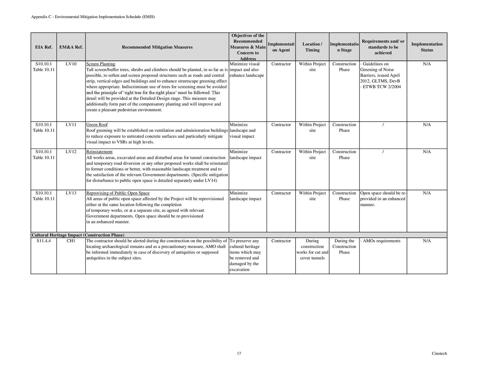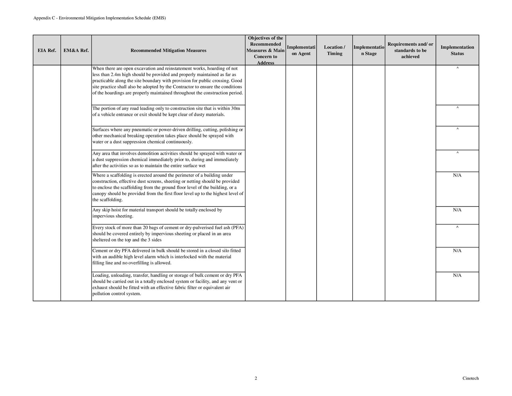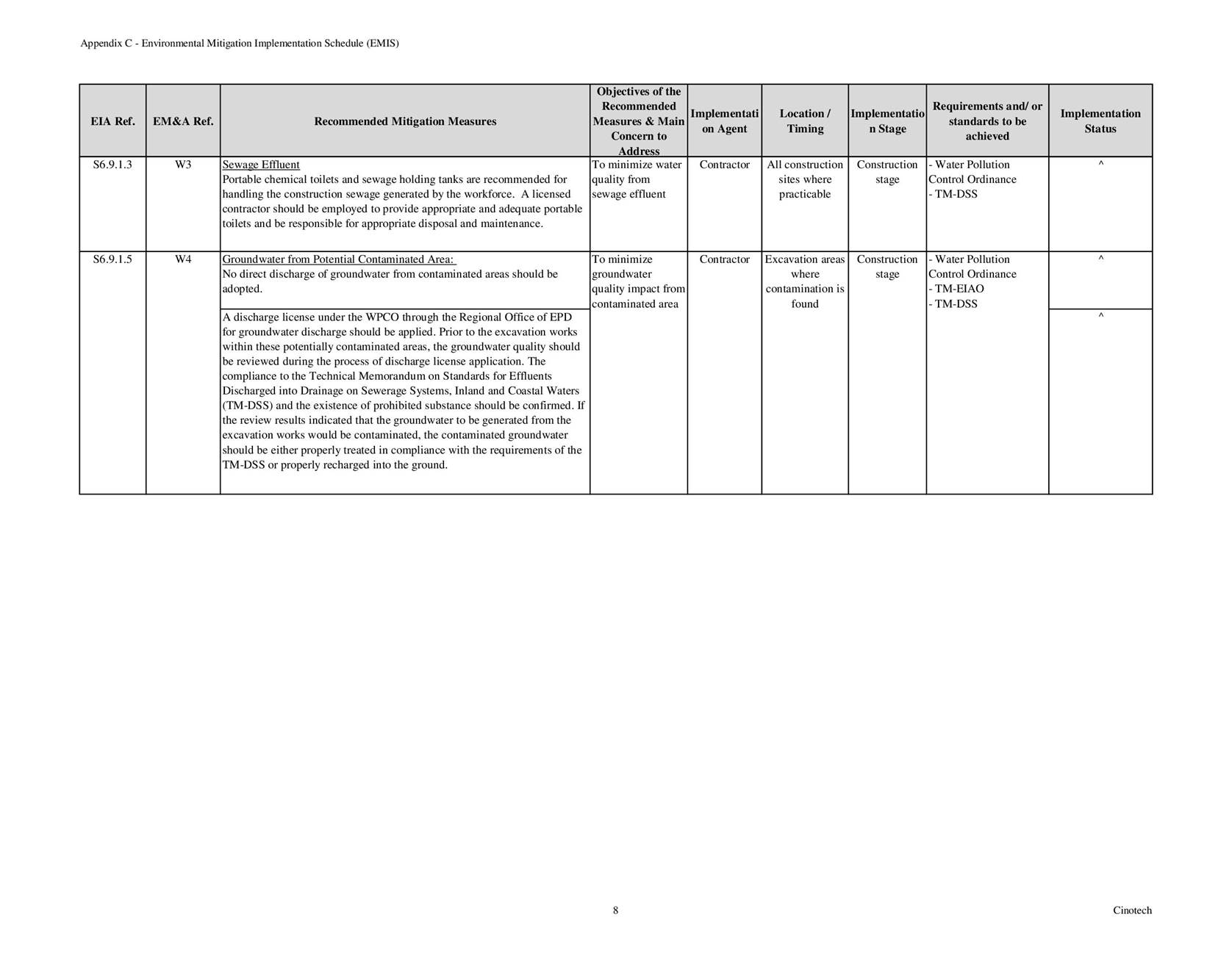 6.3 According to Environmental Permit, the approved EIA Report (Register No.: AEIAR-171/2013), and the EM&A Manual of the Project, the mitigation measures detailed in the documents are recommended to be implemented during the construction phase. An Environmental Mitigation Implementation Schedule (EMIS) is provided in Appendix C.