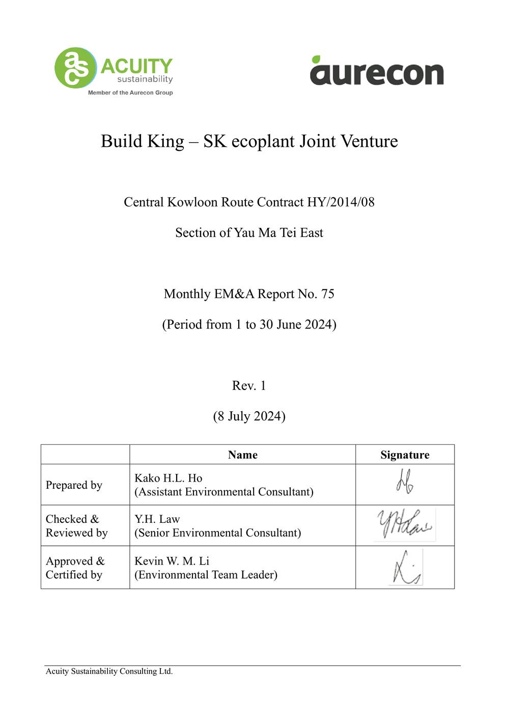 A.1 Build King – SK ecoplant Joint Venture (“Contractor”) commenced the construction works of Highway Department (HyD) Central Kowloon Route Contract No. HY/2014/08 – Section of Yau Ma Tei East (“The Project”) on 20 April 2018. This is the 75th monthly Environmental Monitoring and Audit (EM&A) report presenting the EM&A works carried out during the period from 1 June 2024 to 30 June 2024.