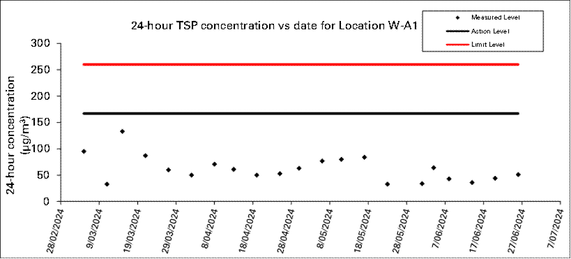 A.7 Two Action Level of construction noise were triggered during the reporting month as documented complaints were received. No exceedance of Limit Level of construction noise was recorded in the reporting month. No exceedance of the Action and Limit Level of 24-hour TSP and 1-hour TSP was recorded in the reporting month.