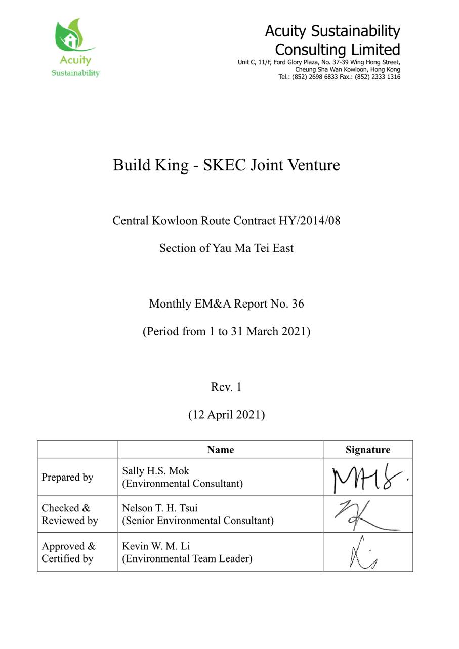 A.1 Build King – SKEC Joint Venture (“Contractor”) commenced the construction works of Highway Department (HyD) Central Kowloon Route Contract No. HY/2014/08 – Section of Yau Ma Tei East (“The Project”) on 20 April 2018. This is the 36th monthly Environmental Monitoring and Audit (EM&A) report presenting the EM&A works carried out during the period from 1 March 2021 to 31 March 2021.