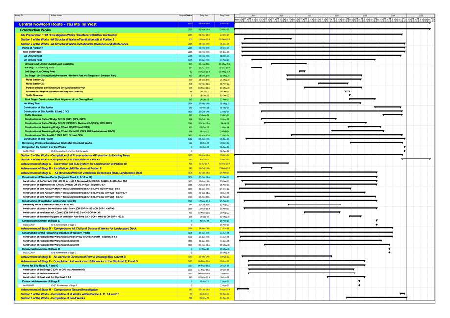 · Socket H-Pile at Portion 1D along Hoi Wang Road · RC Works for Vent. Adit Ch 90~130 (Zone 3) at Portion 1E · Construction of Noise Barrier C03 & S01 (along Lin Cheung Road) at Portion 1E · Bridge Deck Construction at Bridge C2 (from C2P1 to C2P2) at Portion 1E · Bridge Deck Construction at Bridge B2 (from existing Pier to B2P1) at Portion 1E · Pile cap and Pier construction for Bridge B (BP1, BP2) and Bridge C (CP2, C2P3-CP3) at Portion 1E · Parapet wall construction at Bridge G at Portion 1B · Re-construction of Box Culvert A (Zone A2) at Portion 1D · ELS and Excavation Works (Segment 4, 7, 10 to 12) for Vent. Adit and Depressed Road Construction including Escape Route Staircase No.1 to 2 at Portion 1F and 10 · Road Slab construction at Portion 1F · RC Works for Vent. Adit Ch 360~410 at Portion 1F · Pile Cap Construction along Hoi Wang Road (Segment 5, 6, 7 and 8) at Portion 1D |