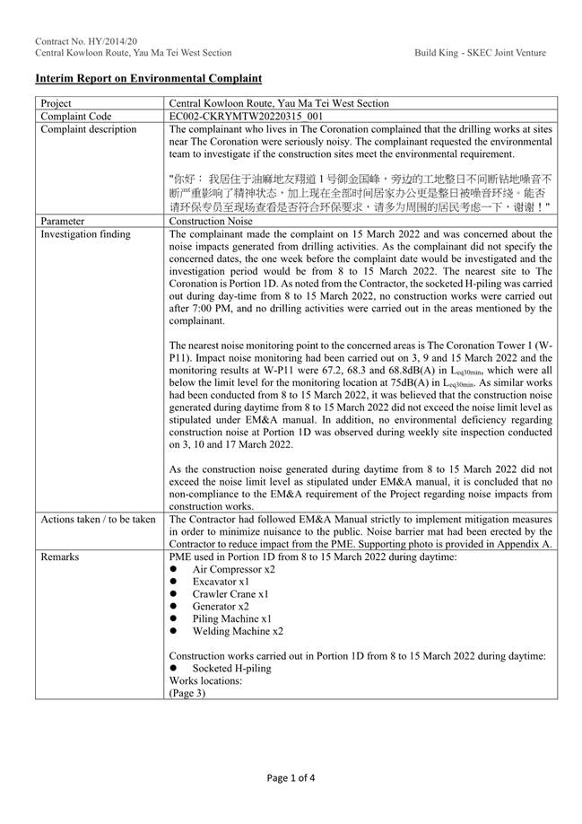 A.8 One noise related complaint was received on 15 March 2022. After investigation with Contractor, precautionary measures had been proposed to the Contractor by ET. The interim reports for the complaints are shown in Appendix Q.