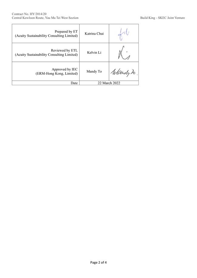 A.1 Build King – SK ecoplant Joint Venture (“Contractor”) commenced the construction works of Highway Department (HyD) Central Kowloon Route Contract No. HY/2014/20 – Section of Yau Ma Tei West (“The Project”) on 12 February 2019. This is the 38th monthly Environmental Monitoring and Audit (EM&A) report presenting the EM&A works carried out during the period from 1 March 2022 to 31 March 2022.