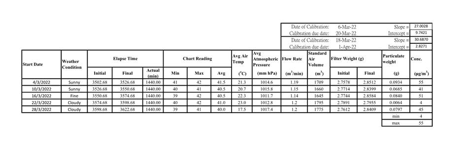 · No Action/Limit Level exceedance for 1-hour TSP was recorded.