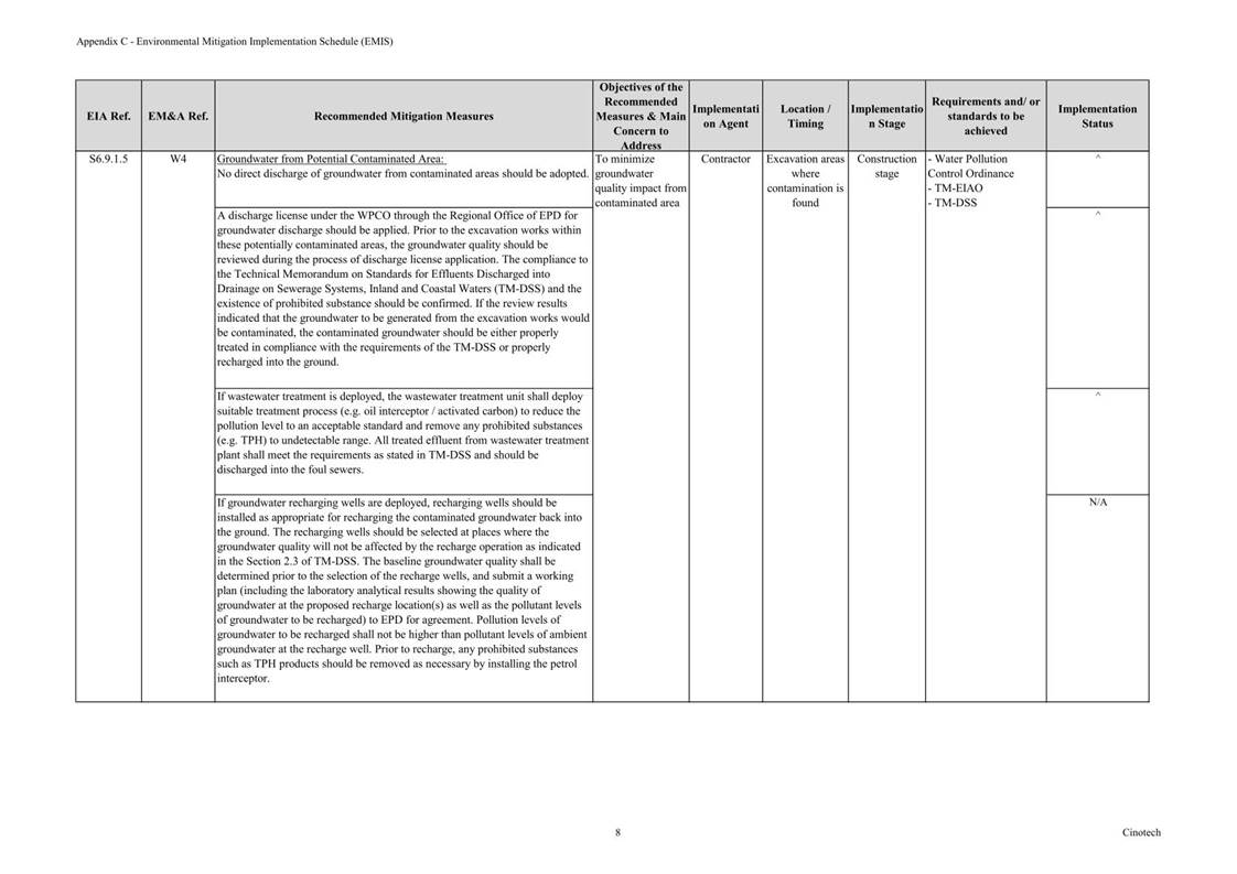 According to Environmental Permit, the approved EIA Report (Register No.: AEIAR-171/2013), and the EM&A Manual of the Project, the mitigation measures detailed in the documents are recommended to be implemented during the construction phase. An Environmental Mitigation Implementation Schedule (EMIS) is provided in Appendix C.