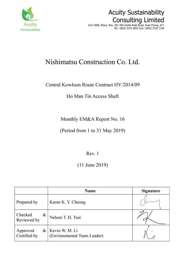 A.1 NISHIMATSU Construction Company Limited (“Contractor”) commenced the construction works of Highway Department (HyD) Central Kowloon Route Contract No. HY/2014/09 - Ho Man Tin Access Shaft (“The Project”) on 20 February 2018. This is the 16th monthly Environmental Monitoring and Audit (EM&A) report presenting the EM&A works carried out during the period from 1 May 2019 to 31 May 2019.