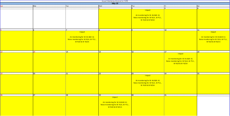 A.5 Inert construction and demolition (C&D) materials and non-inert C&D materials were the wastes that generated from this Project. During May 2019, 3395.31 tonnes inert C&D material was generated from the Project. No plastics was generated and sent to recyclers for recycling during reporting period. 27.5 kg paper/ cardboard packaging was generated and sent to recyclers for recycling during reporting period. About 6.72 tonnes of non-recyclable non-inert C&D materials, such as general refuse, were disposed of at landfill. 0 kg of chemical waste and 1 kg of metal were generated during this reporting month.