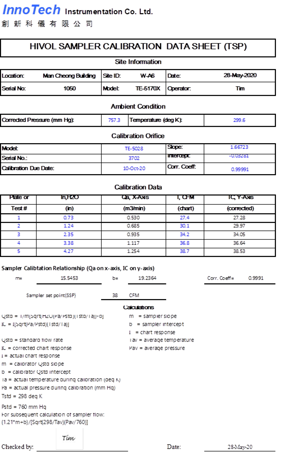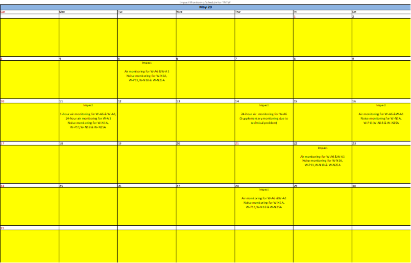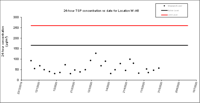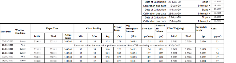 A.4 Due to the technical problem for HVS equipment on 11 May 2020 at Man Cheong Building (W-A6), 24-hour TSP dust monitoring was suspended. Immediate equipment inspection was conducted and the problem was fixed. Supplementary 24-hour TSP dust monitoring was conducted on 14 May 2020.