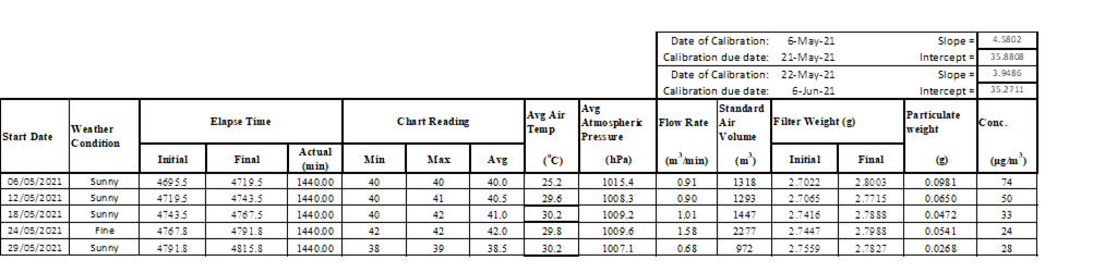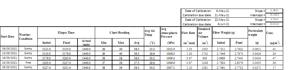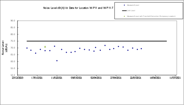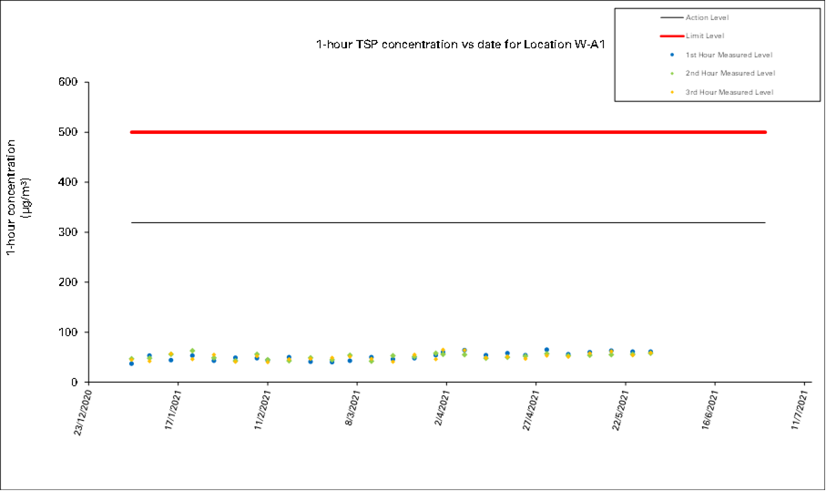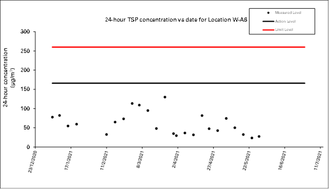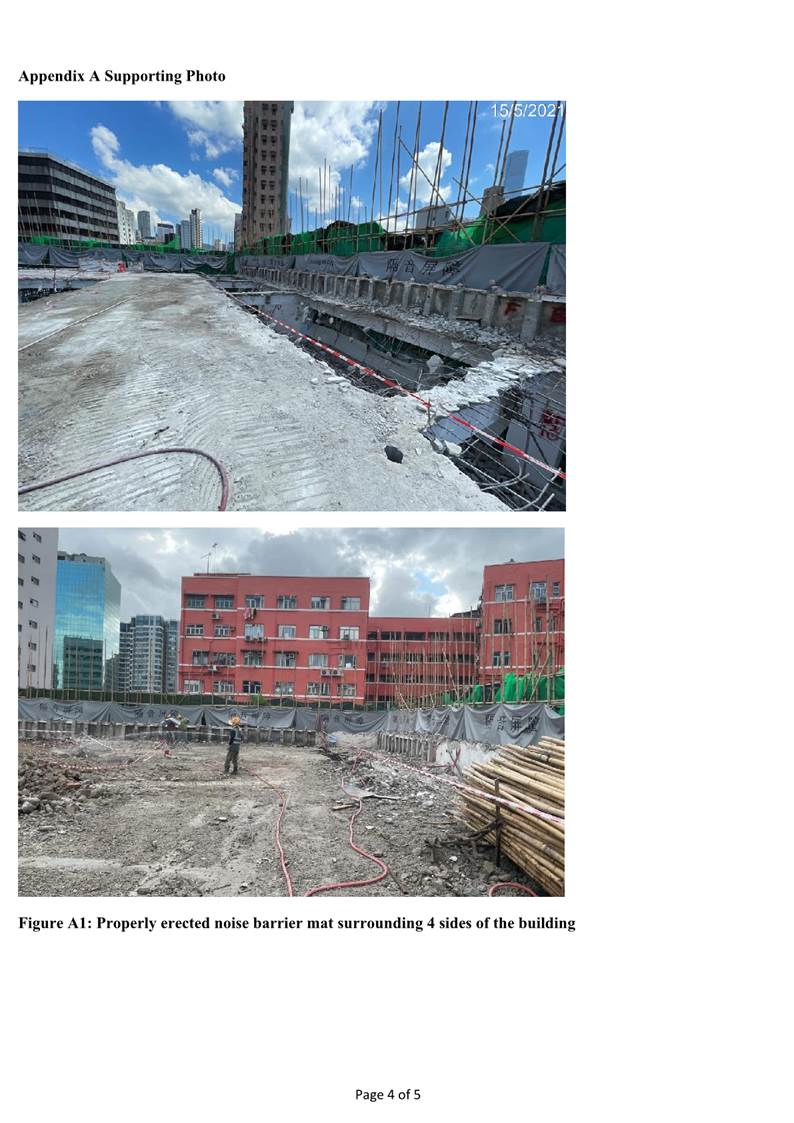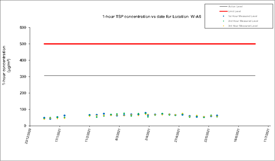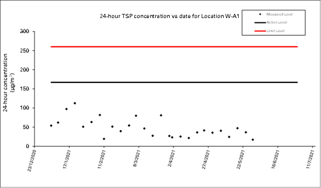 A.7 Two Action Levels of construction noise were triggered during the reporting period as two documented complaints were received on 7 and 24 May 2021 related to construction noise from demolition of Multi-storey Carpark Building and site at Ching Ping Street. No exceedance of Limit Level of construction noise was recorded in the reporting month. No exceedance of the Action and Limit Levels of 24-hour TSP and 1-hour TSP was recorded during the reporting month.