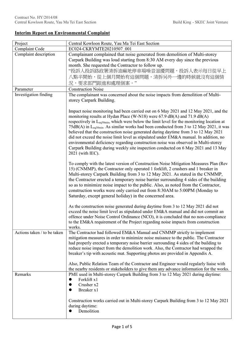 A.8 Two noise-related complaints were received on 7 and 24 May 2021. After investigation with Contractor, precautionary measures had been proposed to the Contractor by ET. The interim reports for the complaints are shown in Appendix Q.