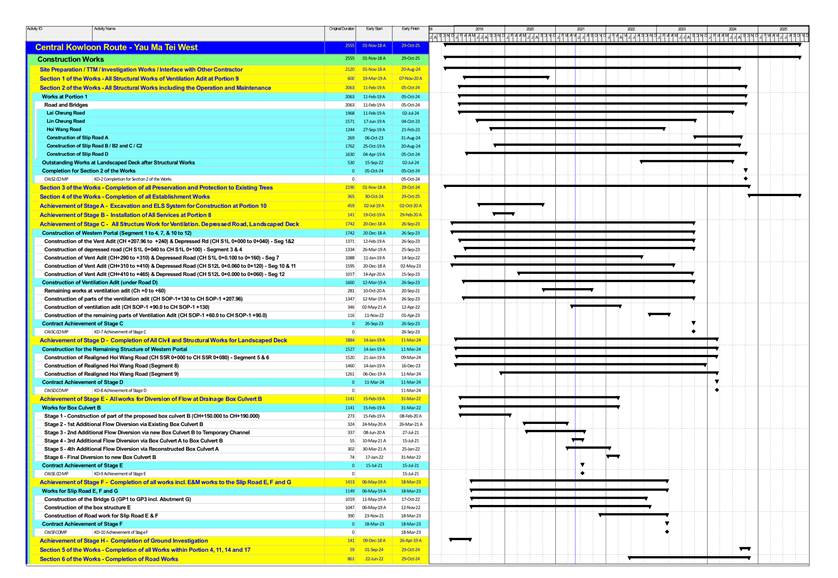 · Pre-drilling Works at Portion 1B, 1D, 1E and 1F · Socket H-pile at Portion 1B, 1D, 1E, 1F and 1G · Removal of existing Steel Bridge at Portion 1B, 1E and 1G · RC works for Vent Adit at Ch 0-60 & Temporary Bulkhead Wall at Portion 9 · ELS and Excavation Works (Segment 4, 7, 10 to 12) for Vent Adit and Depressed Road Construction at Portion 1F and 10 · Guide Wall and D-Wall breaking works and Capping Beam Construction at Portion 1F · Pipe Jacking for DN 1650 sewer at Portion 1B and 17 · GRP Pipe Installation for New Sewerage at Portion 17, 1B and 1G · Vent Adit Ch 130~175 at Portion 1B · Bridge Deck Construction at Bridge B2/C2 (C2P1, C2P2 and B2P1) at Portion 1E · Pile Cap for B2P3 (Bridge B2) at Portion 1G · Temporary Lin Cheung Road (2nd Diversion) at Portion 1E · Foundation for Noise Barrier C02 & S01 along Lin Cheung Road at Portion 1E · ELS and Excavation prior to Box Culvert B Construction and Vent Adit Ch250-280 at Portion 1D · Construction of Vent Adit Ch 250~280 at Portion 1D · Construction of Box Culvert B (Zone 4A) at Portion 1D · Bridge Deck Construction at Bridge G at Portion 1B |