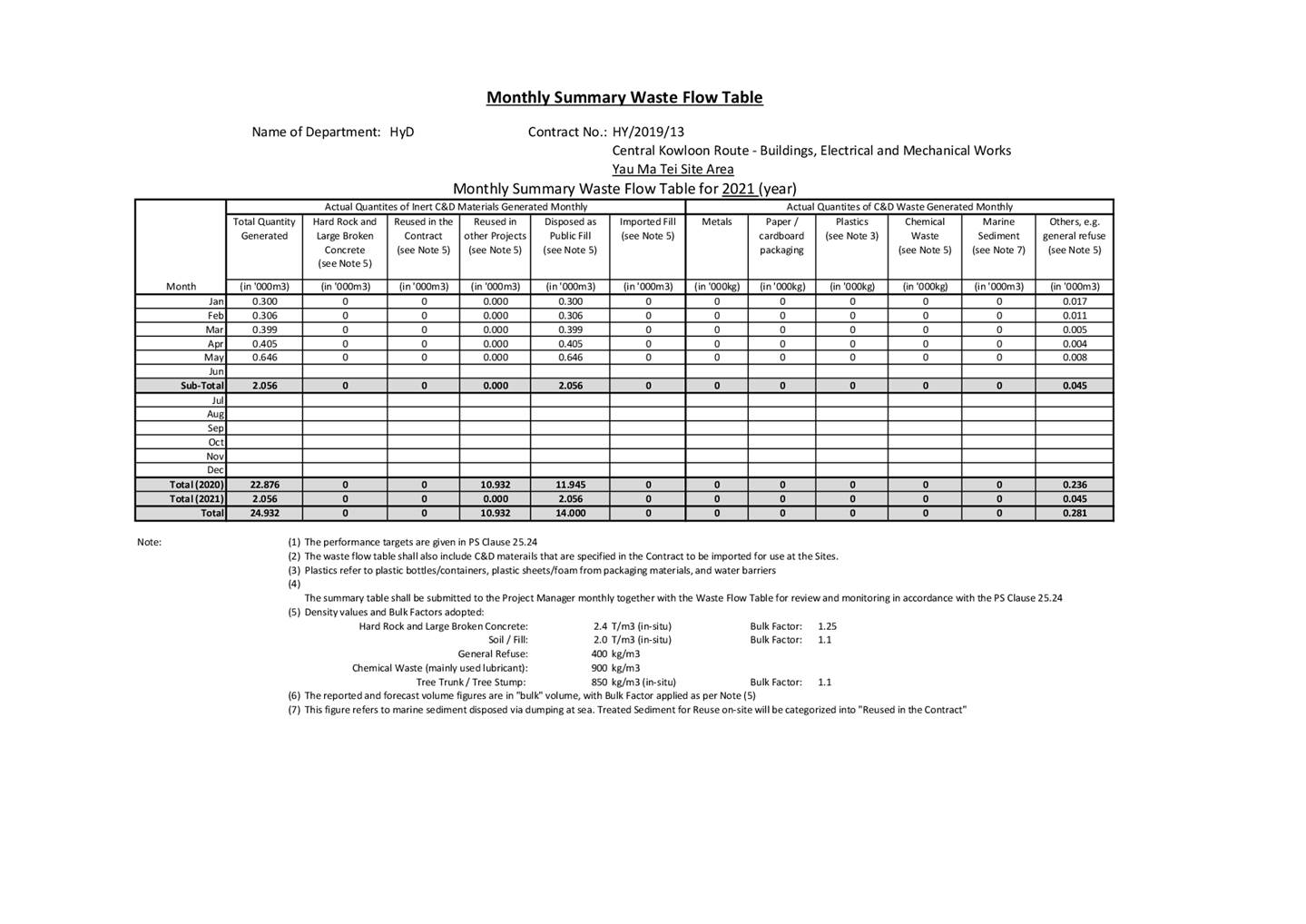 4.3 Site audits were carried out on a weekly basis to monitor and audit to ensure that proper storage, transportation and disposal practices of waste materials generated during construction activities, such as construction and demolition (C&D) materials and general refuse are being implemented. The summary of site audits are shown in Table 6.1 of this report. The implementation status of the waste/chemical management measures in the reporting period are summarized in Appendix C.
