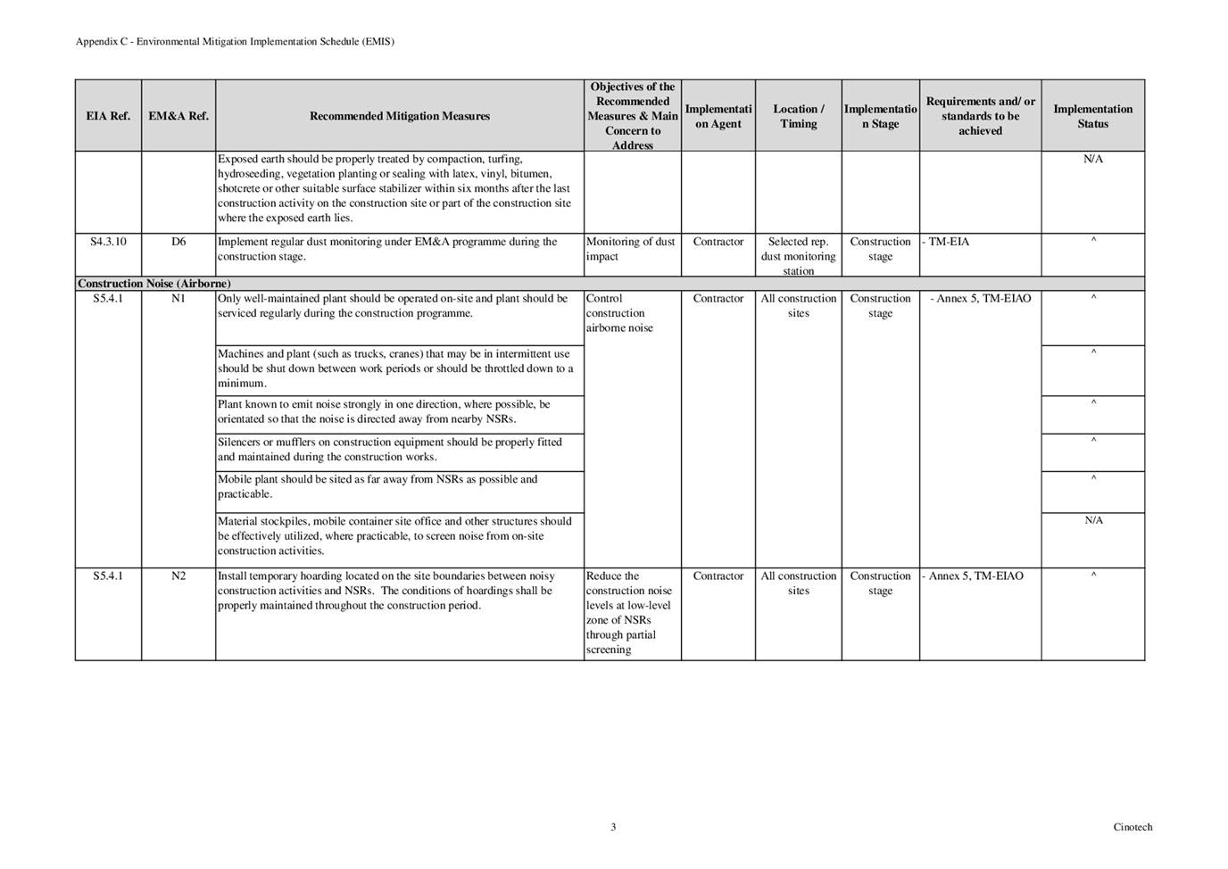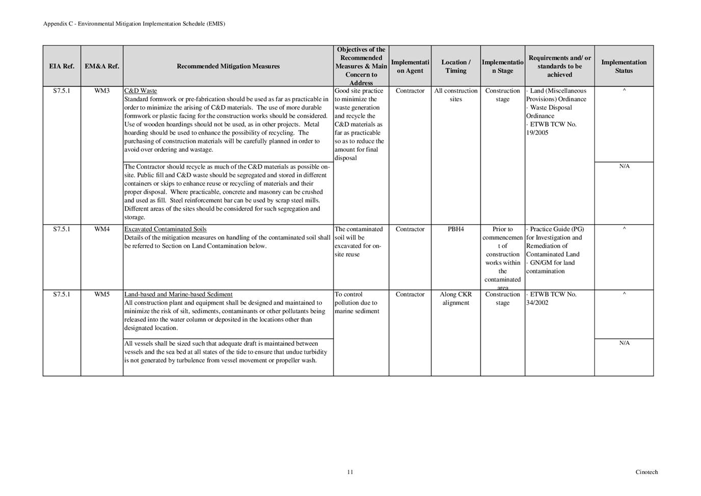 6.3 According to Environmental Permit, the approved EIA Report (Register No.: AEIAR-171/2013), and the EM&A Manual of the Project, the mitigation measures detailed in the documents are recommended to be implemented during the construction phase. An Environmental Mitigation Implementation Schedule (EMIS) is provided in Appendix C.