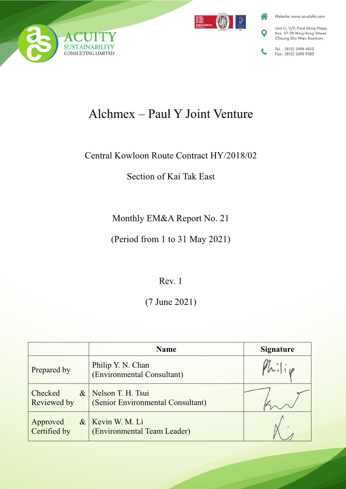 A.1 Alchmex – Paul Y Joint Venture (“Contractor”) commenced the construction works of Highway Department (HyD) Central Kowloon Route Contract No. HY/2018/02 – Section of Kai Tak East (“The Project”) on 9 September 2019. This is the 21st monthly Environmental Monitoring and Audit (EM&A) report presenting the EM&A works carried out during the period from 1 May 2021 to 31 May 2021.