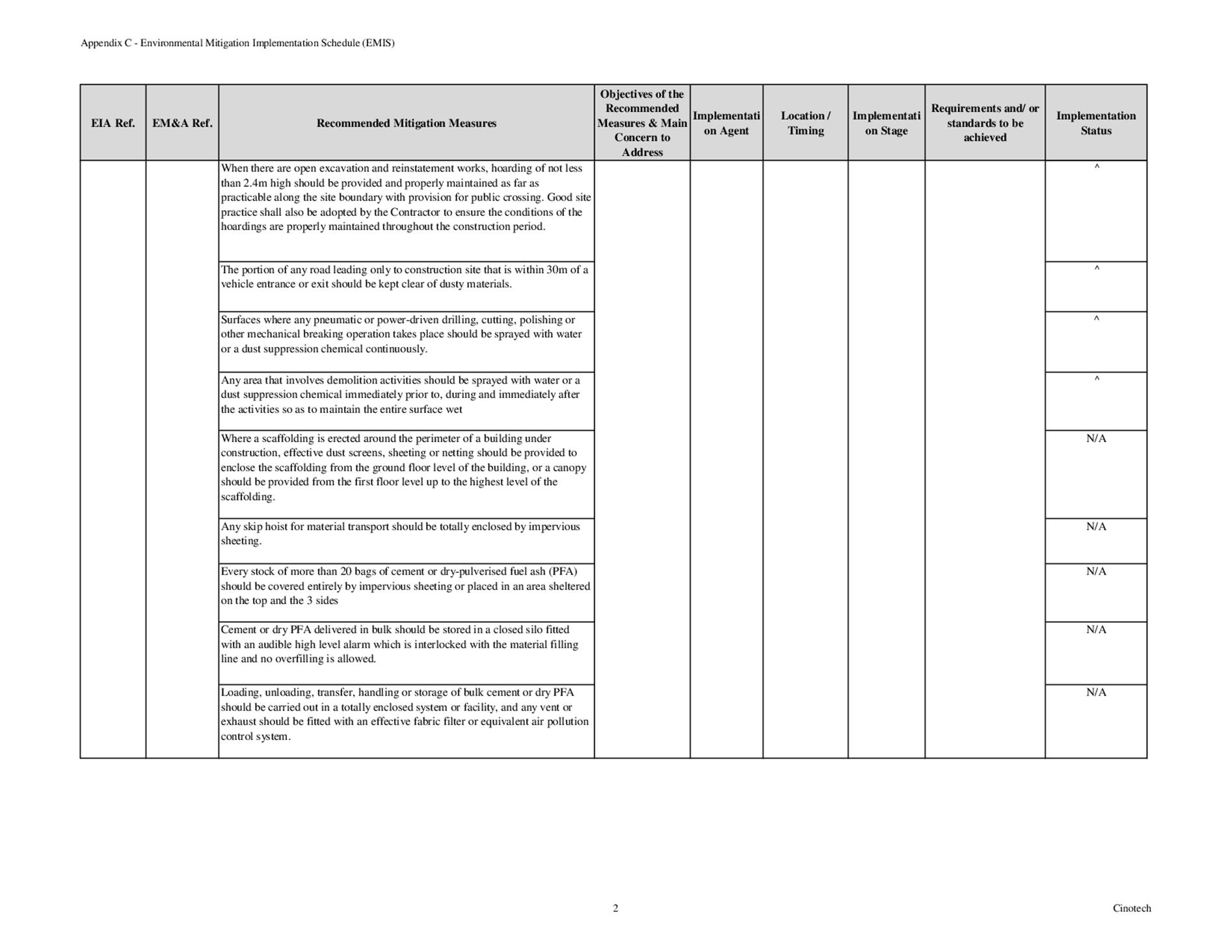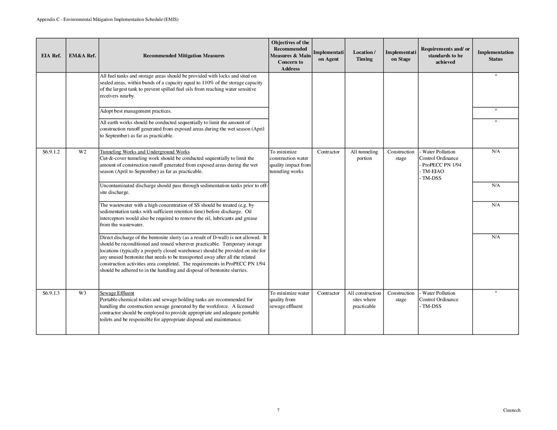 6.3 According to Environmental Permit, the approved EIA Report (Register No.: AEIAR-171/2013), and the EM&A Manual of the Project, the mitigation measures detailed in the documents are recommended to be implemented during the construction phase. An Environmental Mitigation Implementation Schedule (EMIS) is provided in Appendix C.