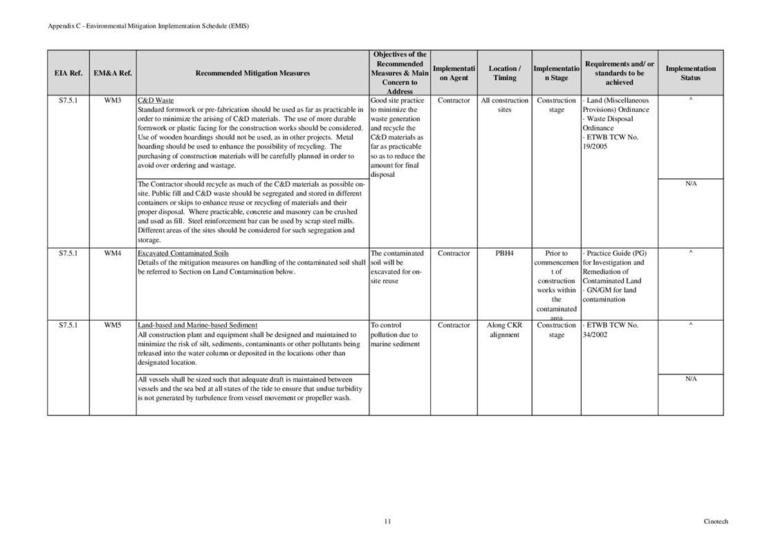 6.3 According to Environmental Permit, the approved EIA Report (Register No.: AEIAR-171/2013), and the EM&A Manual of the Project, the mitigation measures detailed in the documents are recommended to be implemented during the construction phase. An Environmental Mitigation Implementation Schedule (EMIS) is provided in Appendix C.