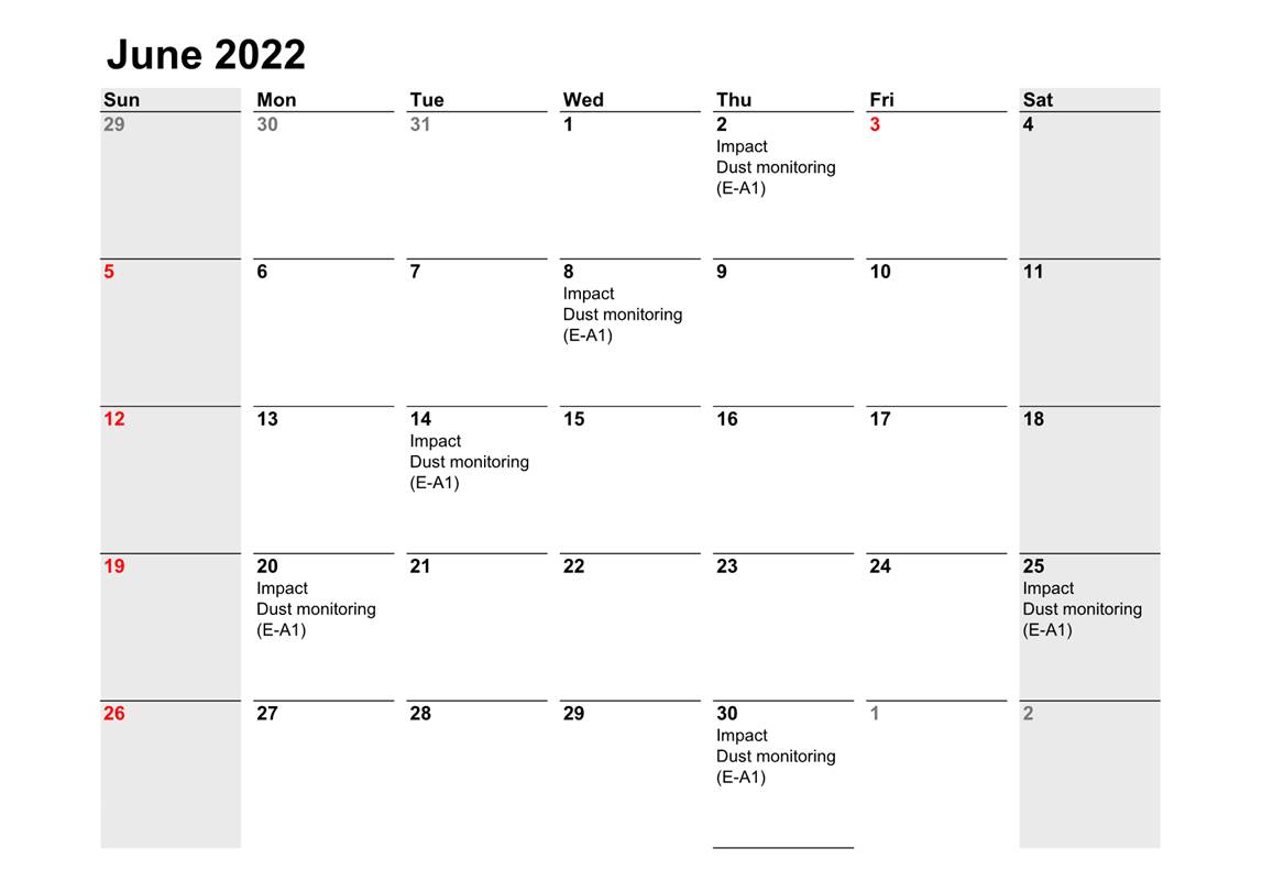 2.2 No Action/Limit Level exceedance was recorded for all 1-hour TSP and 24-hour TSP monitoring in the reporting month.