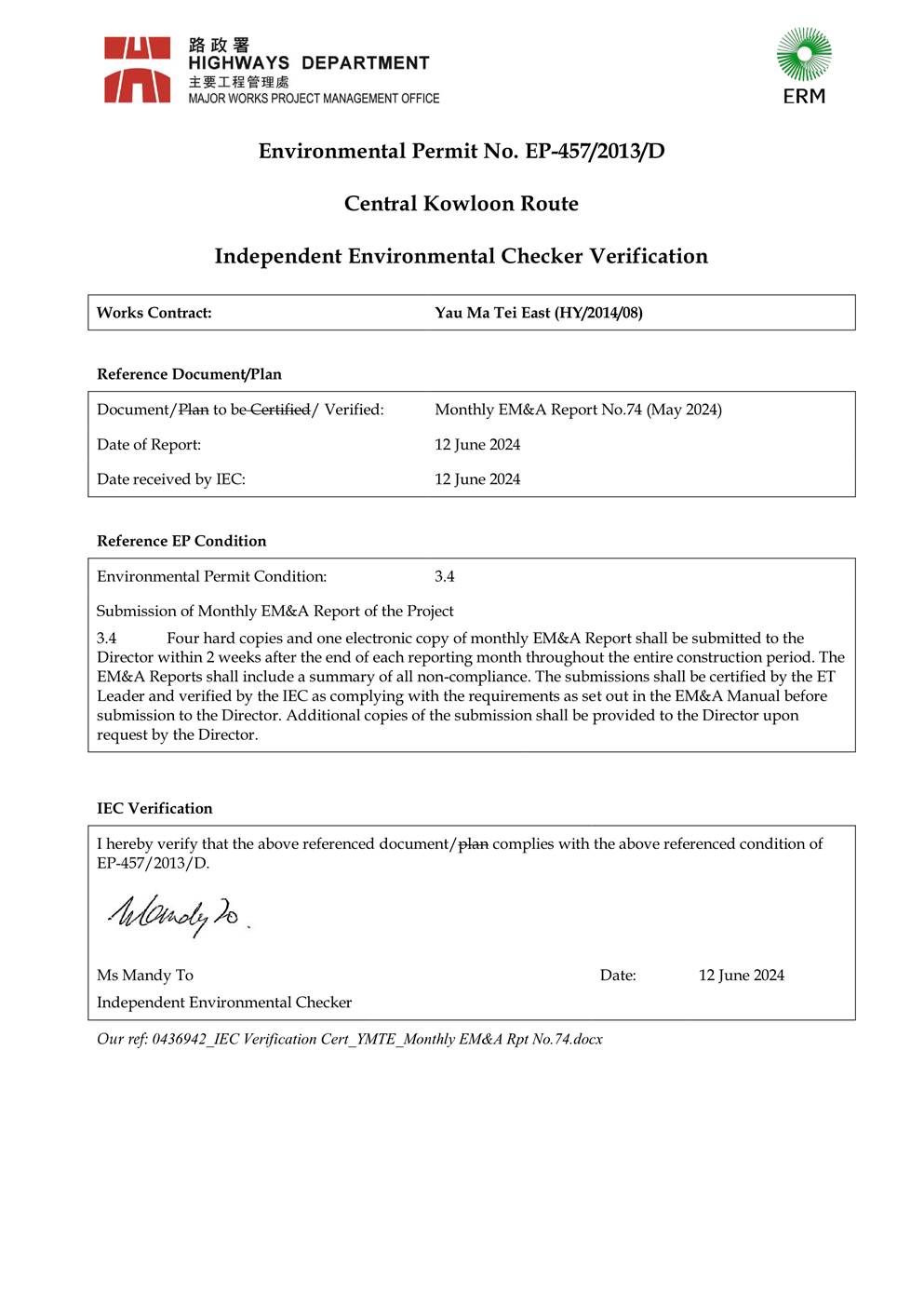 1.2. The Central Kowloon Route – Design and Construction Environmental Impact Assessment Report (Register No.: AEIAR-171/2013) was approved with conditions by the Environmental Protection Department (EPD) on 11 July 2013. An Environmental Permit (EP 457/2013) was issued on 9 August 2013. Variations of EP (VEP) was applied for and the EP (EP-457/2013/C) was issued by EPD on 16 January 2017. Variations of EP (VEP) was subsequently applied for and the latest EP (EP-457/2013/D) was issued by EPD on 15 June 2021. A Further EP (FEP-03/457/2013/D) was issued by EPD on 5 November 2021.