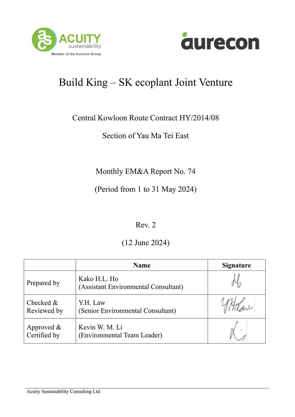 A.1 Build King – SK ecoplant Joint Venture (“Contractor”) commenced the construction works of Highway Department (HyD) Central Kowloon Route Contract No. HY/2014/08 – Section of Yau Ma Tei East (“The Project”) on 20 April 2018. This is the 74th monthly Environmental Monitoring and Audit (EM&A) report presenting the EM&A works carried out during the period from 1 May 2024 to 31 May 2024.