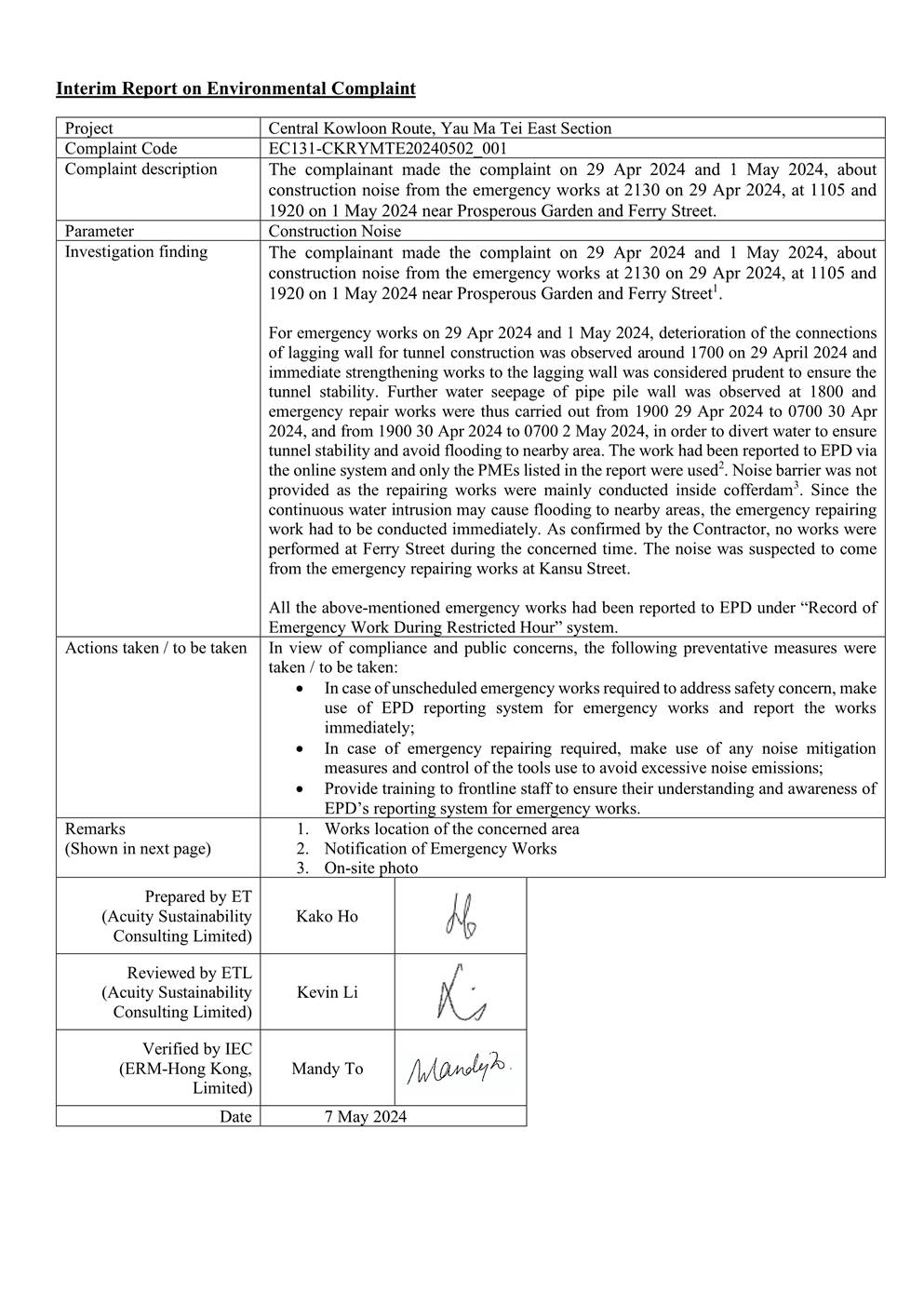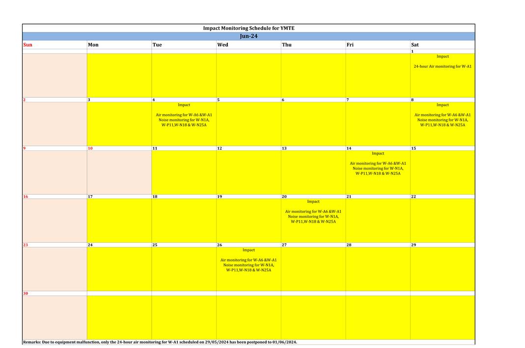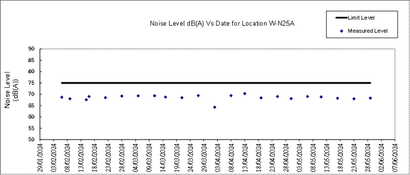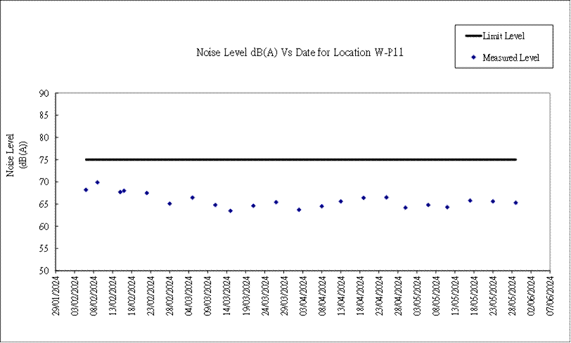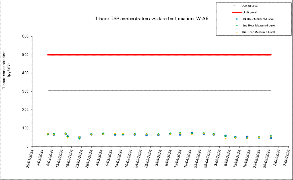 A.7 One Action Level of construction noise was triggered during the reporting month as documented complaints were received. No exceedance of Limit Level of construction noise was recorded in the reporting month. No exceedance of the Action and Limit Level of 24-hour TSP and 1-hour TSP was recorded in the reporting month.