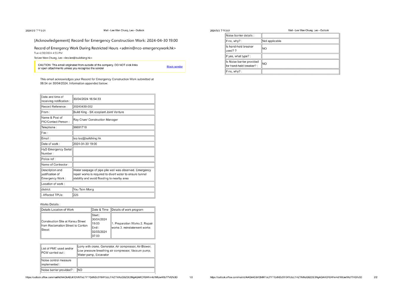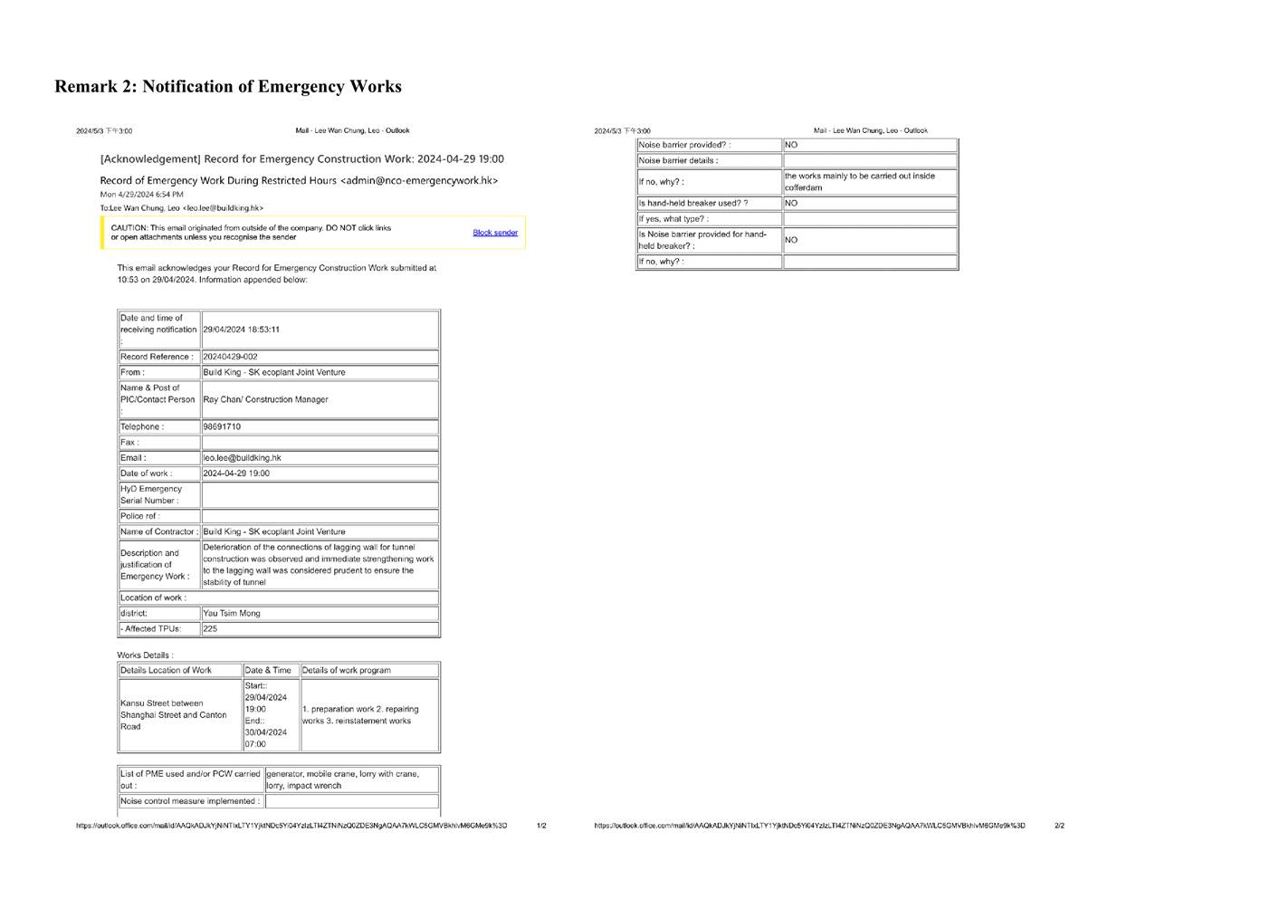 l Complete closing the temporary openings, remove ELS, remove ELS L1 & L2 and complete remaining road works at Zone A westbound l Complete closing the openings and road works at Zone EB2/C1/C2/C3/D2/D3 l Construct ceiling slab/lagging wall from roof slab to ceiling slab and excavation down to ELS L3 at Zone WB1 westbound l Construction of roof slab, excavation down to ceiling slab and construction of ceiling slab (CB2b) at Zone B3 westbound l Install hanger supports for CLP Cable Tunnel A, excavation down to L3 for installation of ELS to L3 and construct transfer beam P2R for Gascoigne Road Flyover pier construction at Zone F l Install ELS L2, L3 and excavation to L4 and install ELS to L3 at Zone G1 l Excavate and install ELS from L4 to L6 at Zone G2 l Bridge Works: i.Complete remaining deck construction (segments 8 to 10) at P4R ii.Remove falsework, backfill to ground level and commence FT installation for P6R iii.End span construction for P7R l Continue erection of secondary tie beams and acoustic panels for Noise Enclosure F02 in Zone 3 (night works). Continue trial pit excavation and DN300 gas main diversion by HKCG along Ching Ping Street for C07 l Works at Zone 2 Noise Enclosure are the following: i.Column A – Complete Column Erection and follow-up backfill to ground level ii.Column E – TTA (KAS193) implemented on 22 Apr 24 and TTA (KAS216) anticipate to implement on 9 May 24 for erection of Column E iii.Columns G - Pending approval of TTA scheme for column erection iv.Columns C – Pending access from tunnel construction for RC plinth construction v.Column D - Pending access for RC plinth construction vi.Column H - RC plinth construction l Noise Enclosure steelworks fabrication at the Fabrication Yards in Zhuhai, China l Underpinning works for existing piers B1 (construct underpinning beam), C2 (construct underpinning beam) and C1 (bracing installation) l Monitoring of instrumentation for all areas |