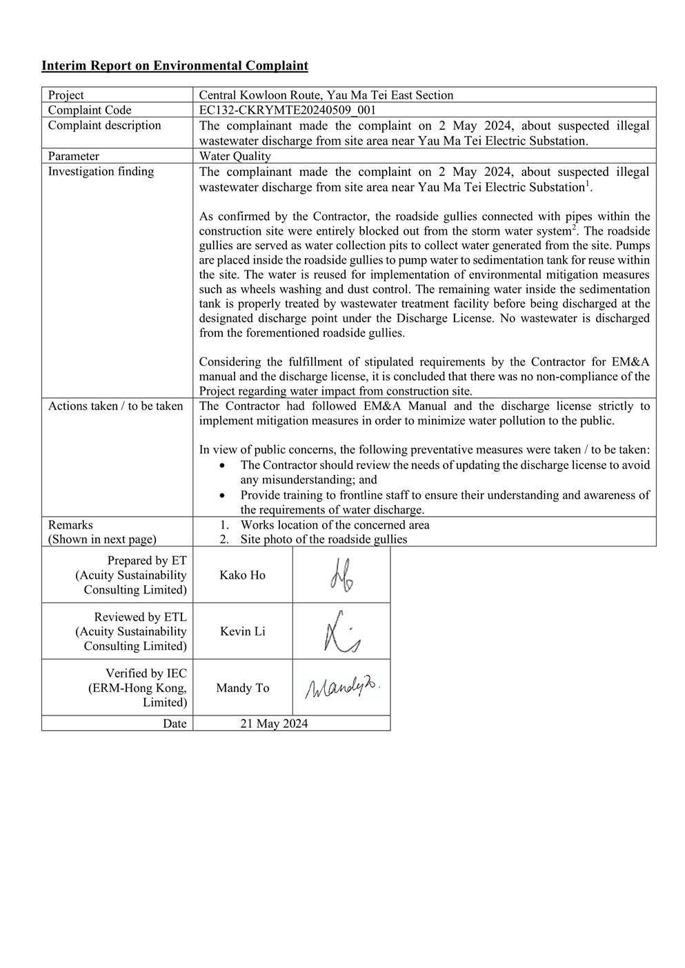 A.8 A total of two environmental complaints were received in the reporting month. After investigation with Contractor, precautionary measures had been proposed to the Contractor by ET. The interim reports for the complaints are shown in Appendix Q.