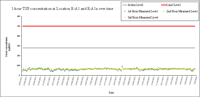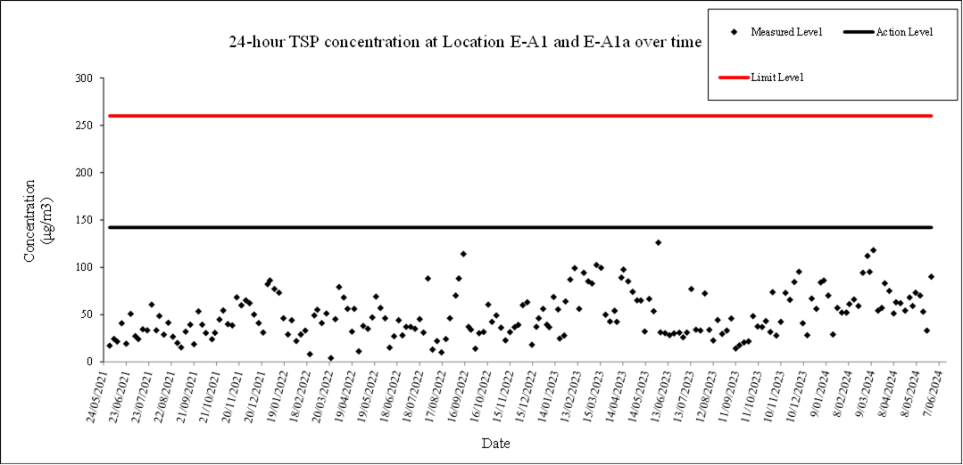 A.7 No exceedance of the Action and Limit Levels of 24-hour TSP and 1-hour TSP monitoring were recorded during the reporting month.