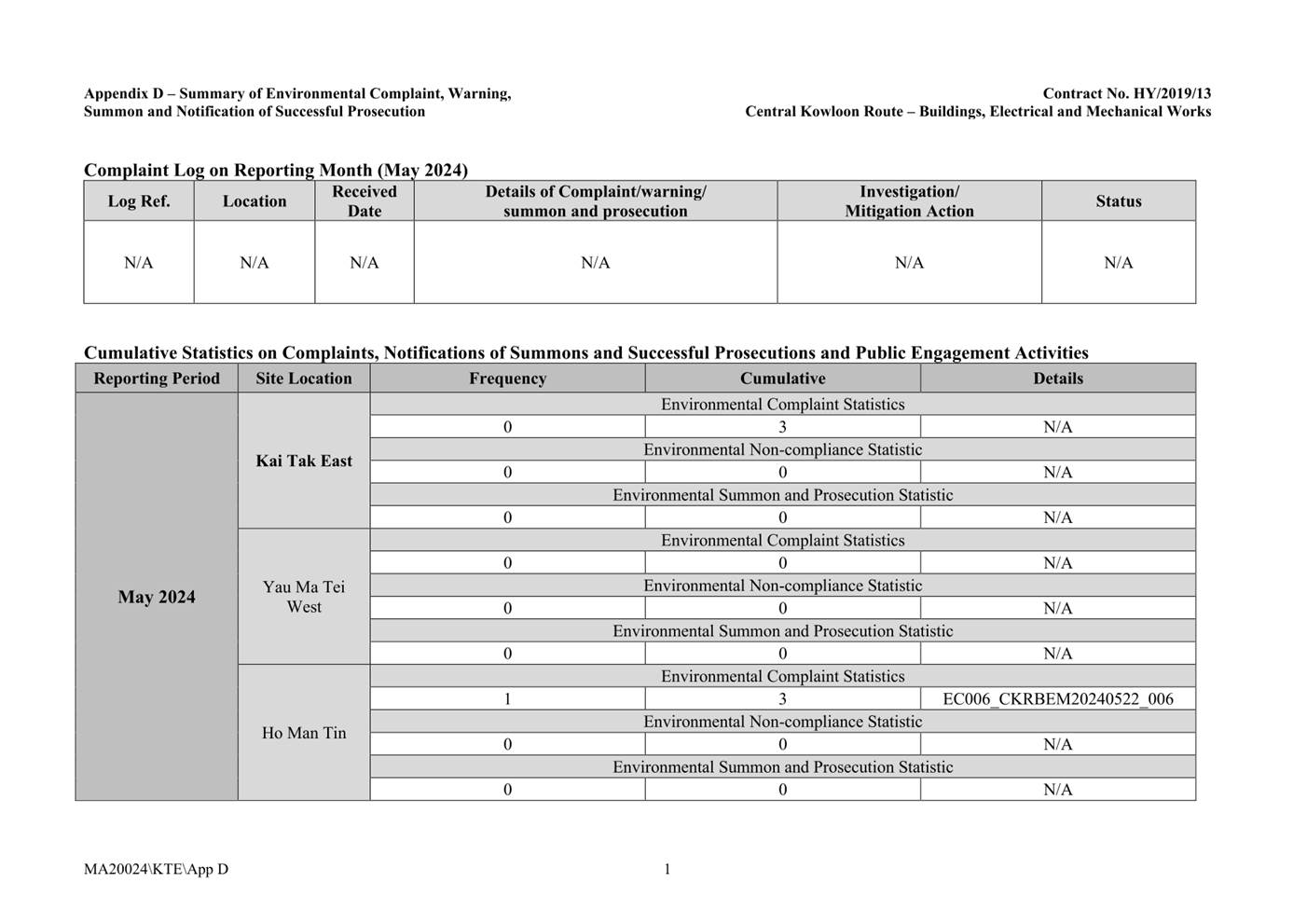 Appendix D Summaries of Environmental Complaint, Warning, Summon and Notification of Successful Prosecution