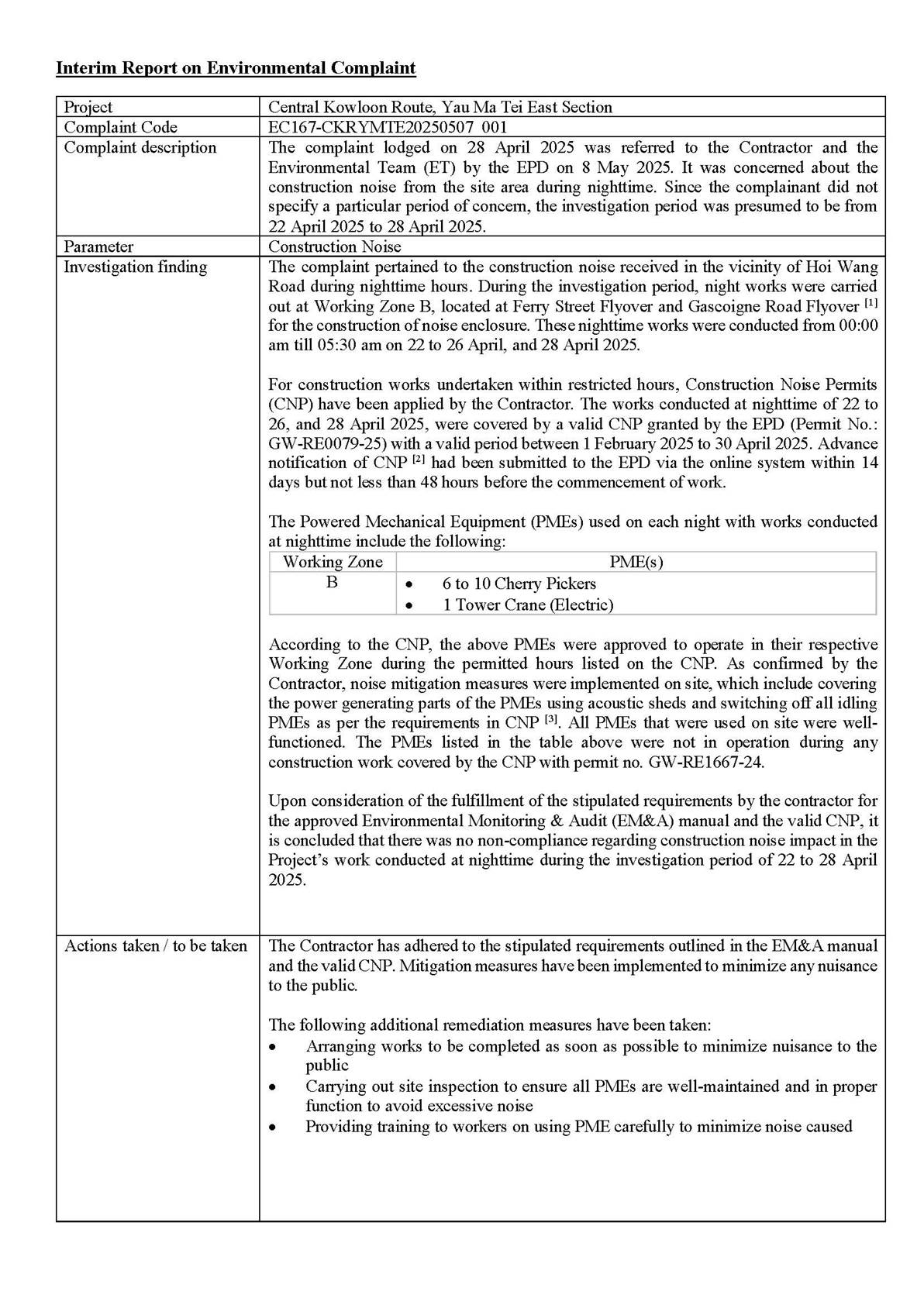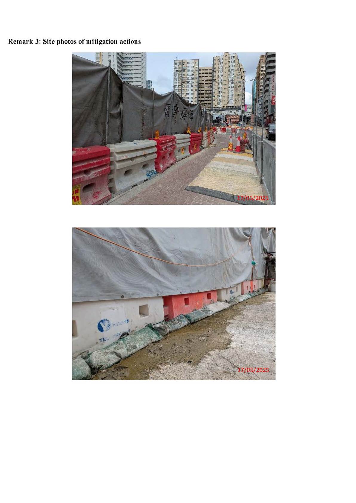 A.7 Two Action Levels of construction noise were triggered during the reporting month as two documented complaints were received. No exceedance of Limit Level of construction noise was recorded in the reporting month. No exceedance of the Action and Limit Level of 24-hour TSP and 1-hour TSP was recorded in the reporting month.