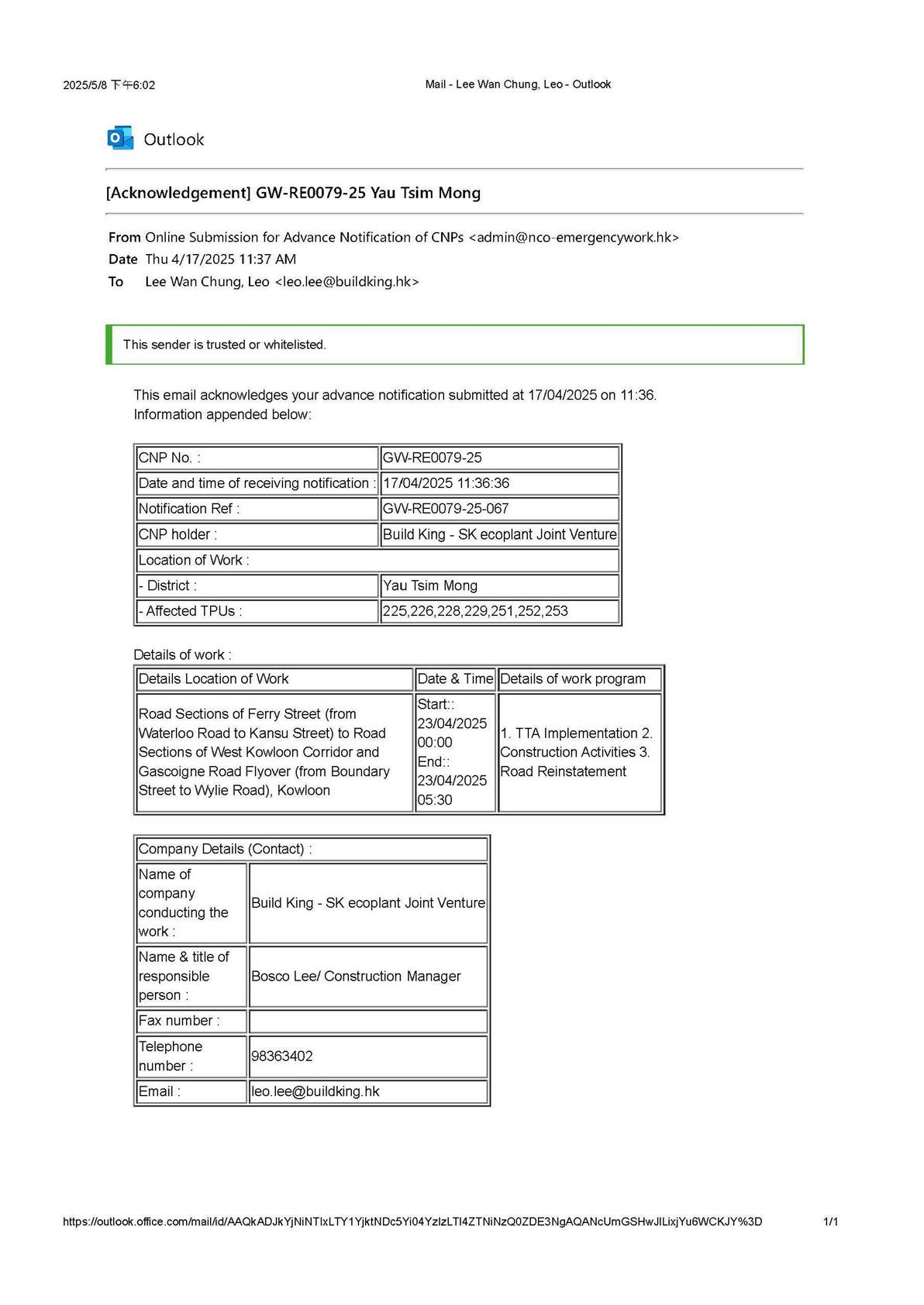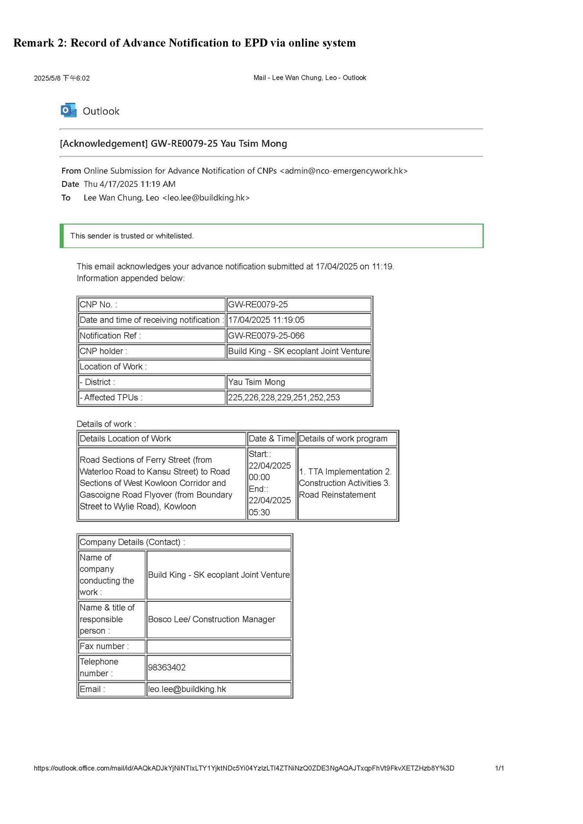 A.1 Build King – SK ecoplant Joint Venture (“Contractor”) commenced the construction works of Highway Department (HyD) Central Kowloon Route Contract No. HY/2014/08 – Section of Yau Ma Tei East (“The Project”) on 20 April 2018. This is the 86th monthly Environmental Monitoring and Audit (EM&A) report presenting the EM&A works carried out during the period from 1 May 2025 to 31 May 2025.