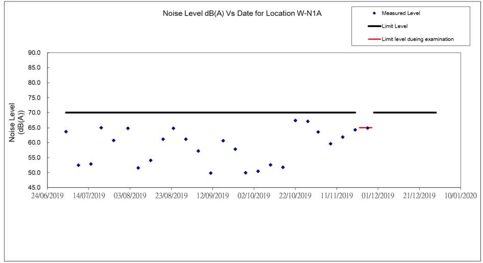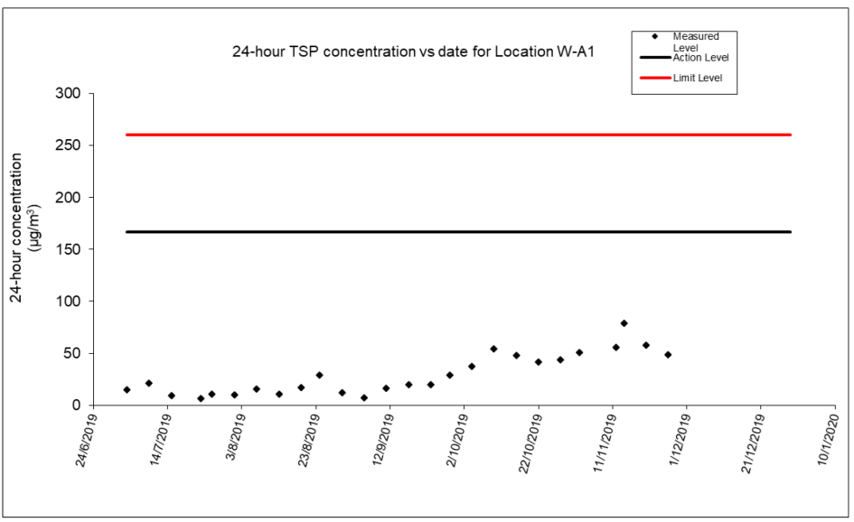 A.4 Due to the short-circuited electricity supply for HVS equipment on 8 November 2019 at Yau Mai Tei Catholic primary School (Hoi Wang Road) (W-A1), 24-hour TSP dust monitoring was suspended. Contact was made with Contractor for immediate follow up on 11 November 2019. Equipment inspection was conducted and the problem was fixed. Supplementary 24-hour TSP dust monitoring was conducted on 12 November 2019.