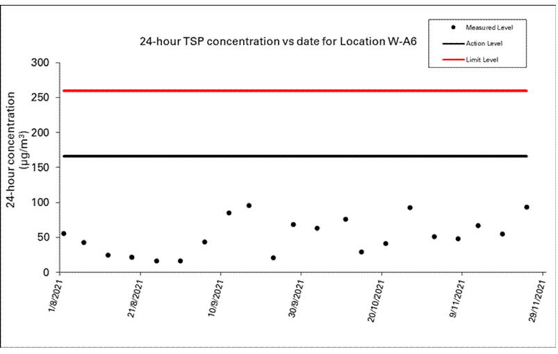 A.7 One Action Level of construction noise was triggered during the reporting period as one documented complaint was received on 25 November 2021 related to construction noise from works areas at Gascoigne Road Flyover(GRF). No exceedance of Limit Level of construction noise was recorded in the reporting month. No exceedance of the Action and Limit Levels of 24-hour TSP and 1-hour TSP was recorded during the reporting month.