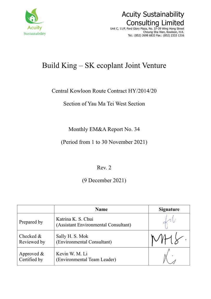 A.1 Build King – SK ecoplant Joint Venture (“Contractor”) commenced the construction works of Highway Department (HyD) Central Kowloon Route Contract No. HY/2014/20 – Section of Yau Ma Tei West (“The Project”) on 12 February 2019. This is the 34th monthly Environmental Monitoring and Audit (EM&A) report presenting the EM&A works carried out during the period from 1 November 2021 to 30 November 2021.