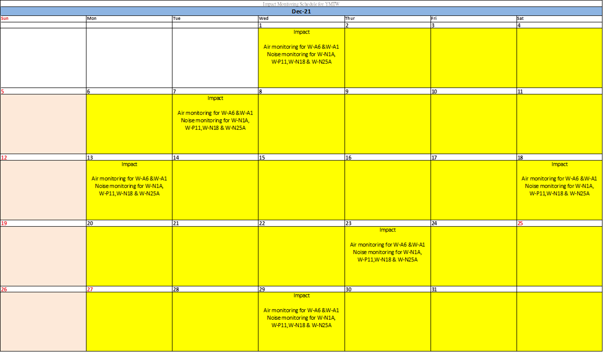 A.5 Joint weekly site inspections were conducted by representatives of the Contractor, Engineer and Contractor’s ET on 4, 11, 18 and 25 November 2021. One joint site inspection with IEC also undertaken on 18 November 2021. Details of the audit findings and implementation status are presented in Section 5.