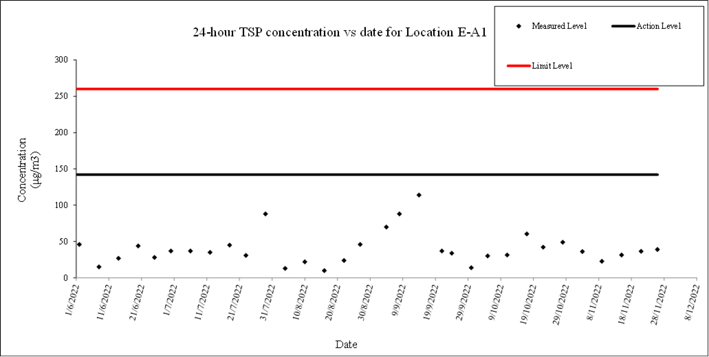 A.7 No exceedance of the Action and Limit Levels of 24-hour TSP and 1-hour TSP monitoring were recorded during the reporting month.