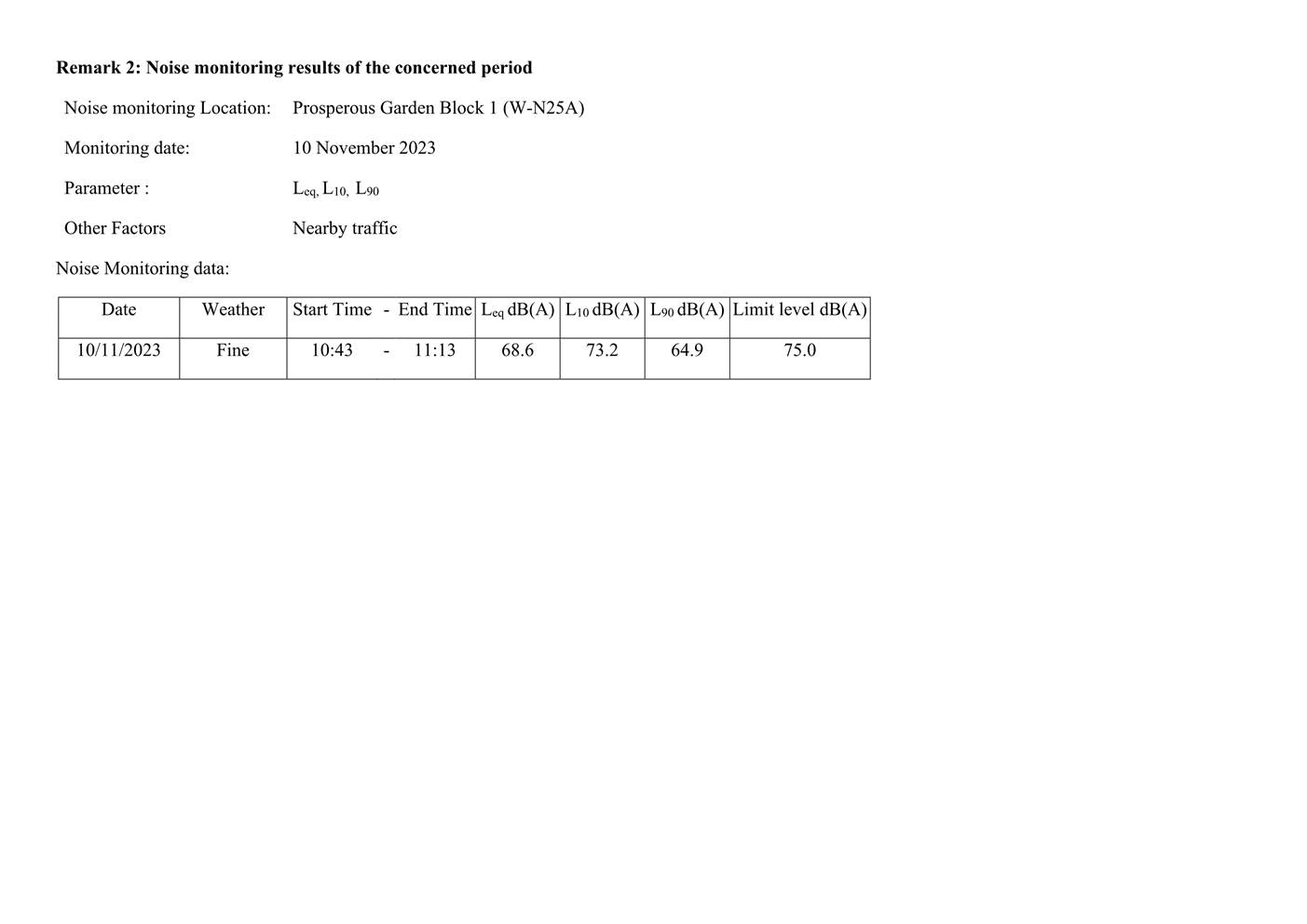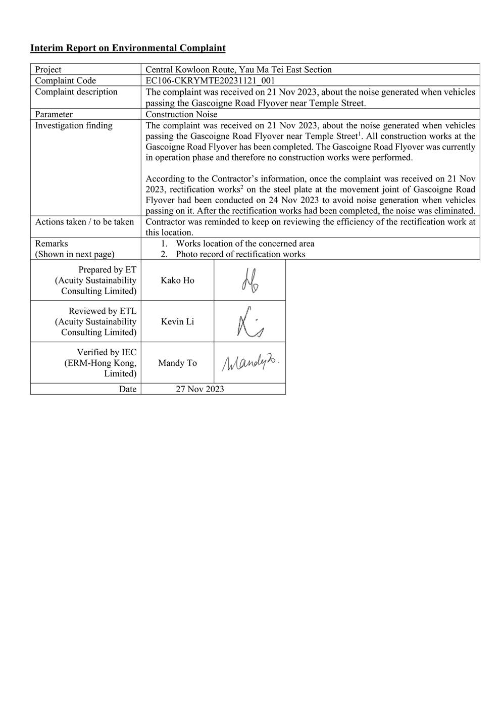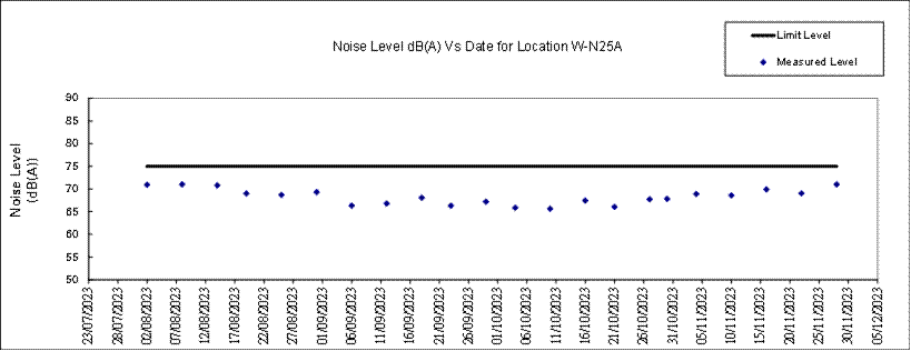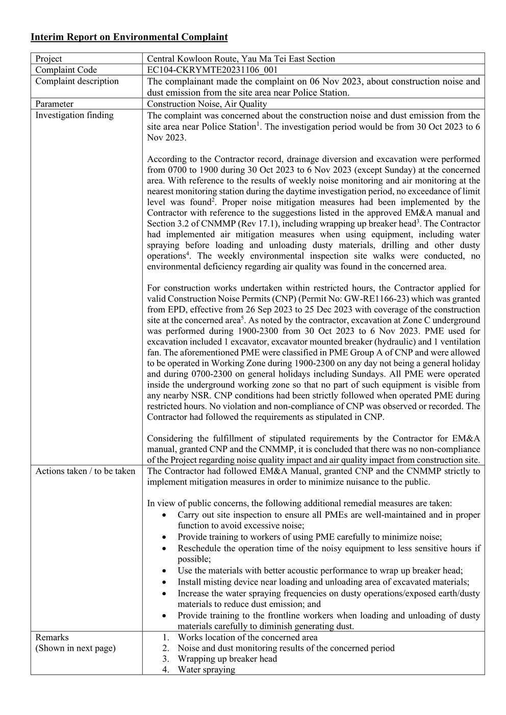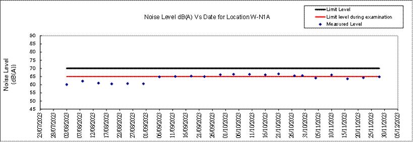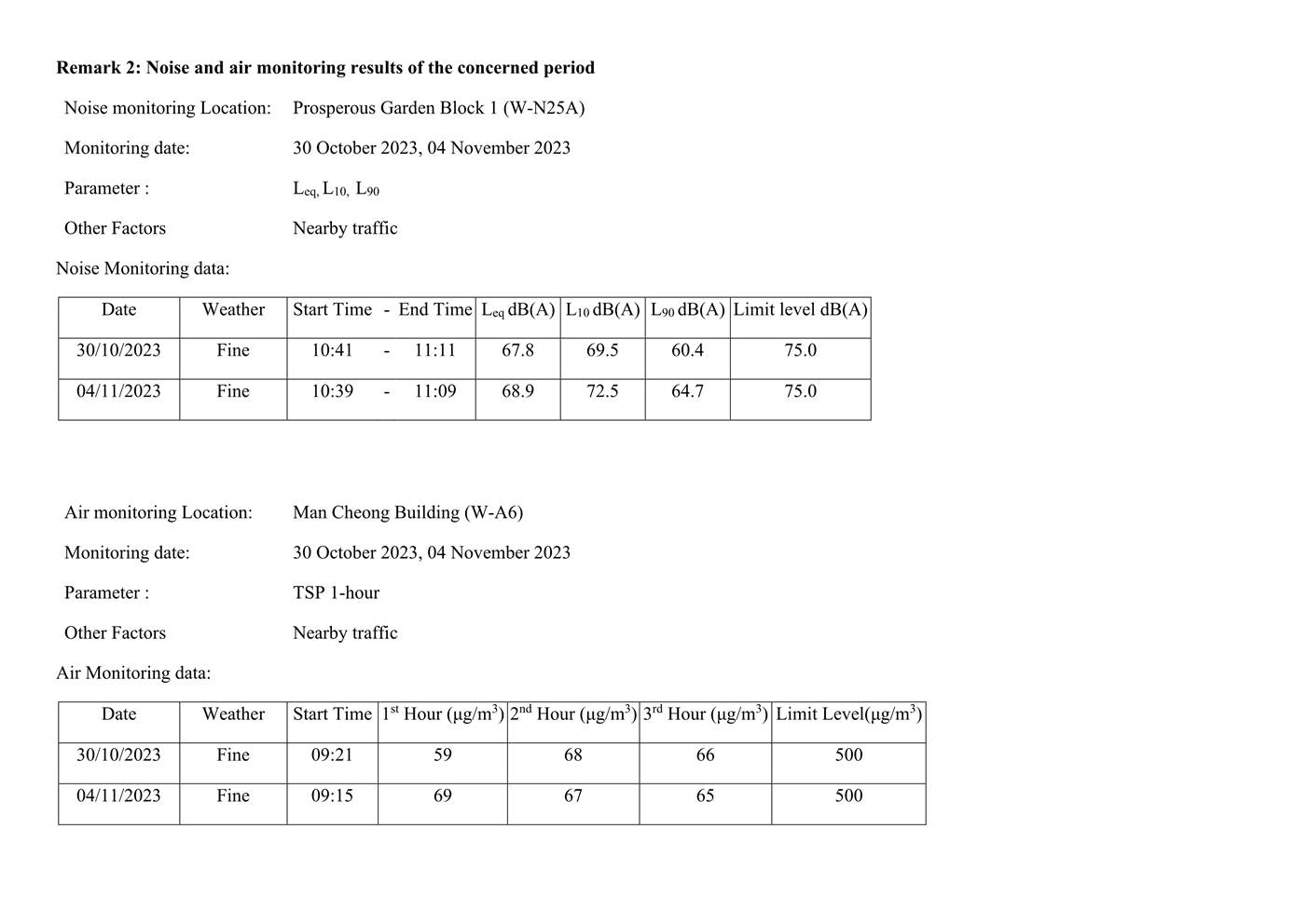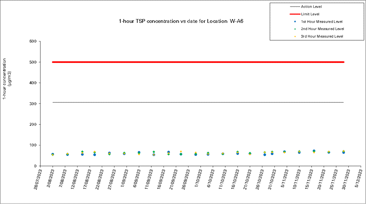 A.7 Five Action Level of construction noise was triggered during the reporting month as documented complaints were received. No exceedance of Limit Level of construction noise was recorded in the reporting month. No exceedance of the Action and Limit Level of 24-hour TSP and 1-hour TSP was recorded in the reporting month.