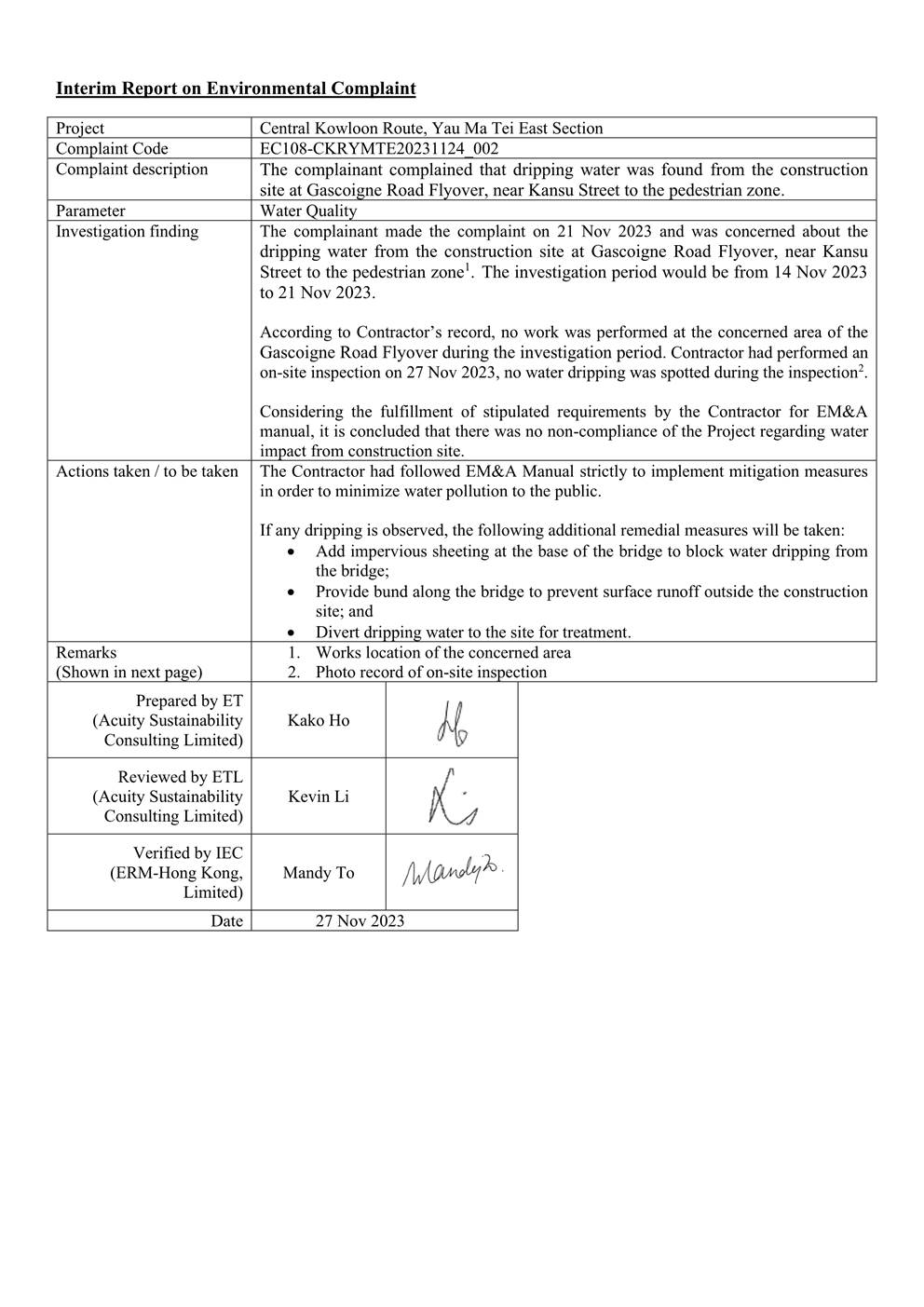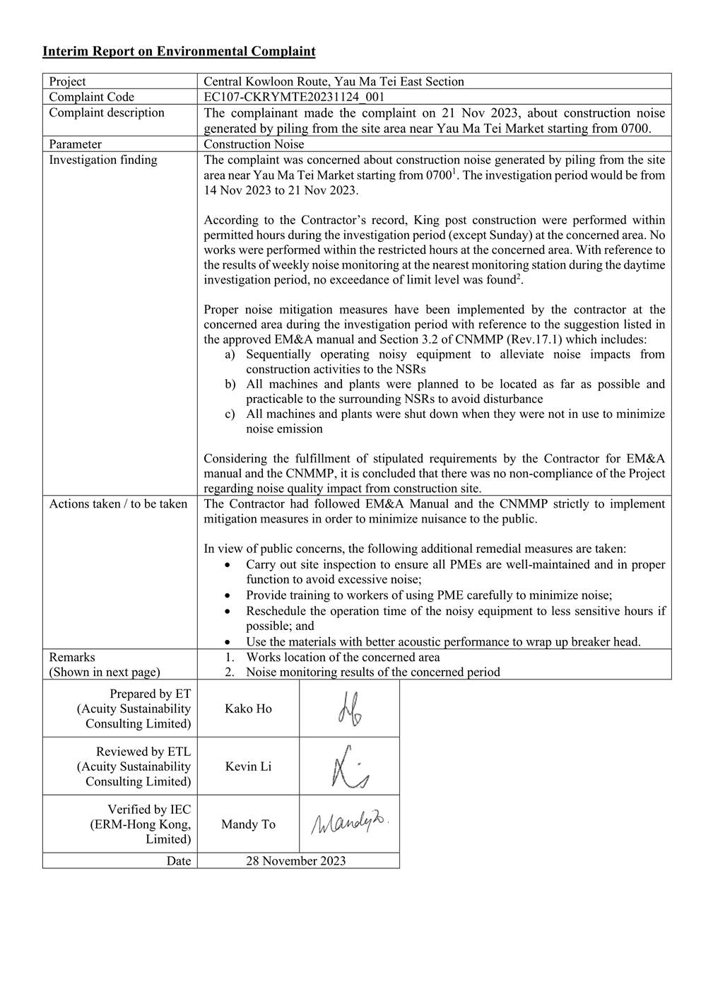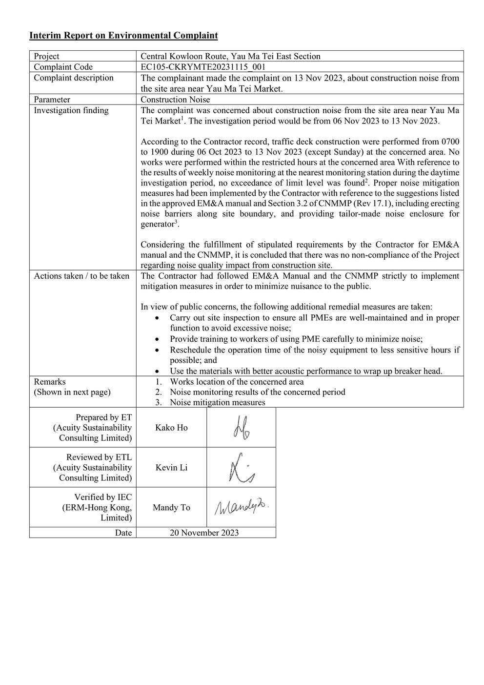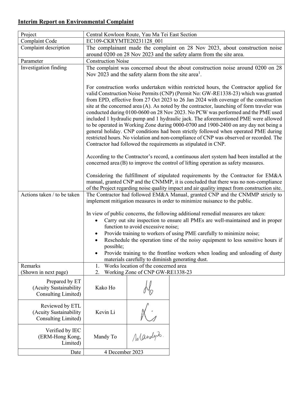 A.8 A total of six environmental complaints were received in the reporting month. After investigation with Contractor, precautionary measures had been proposed to the Contractor by ET. The interim reports for the complaints are shown in Appendix Q.