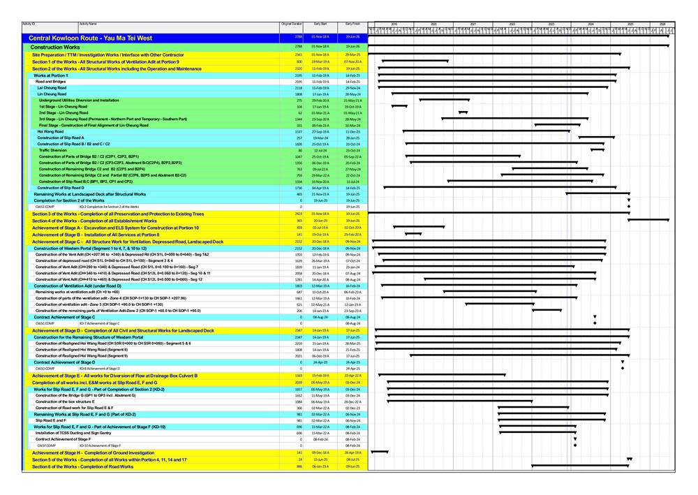 · Remaining Socket H-Pile at Segments 5, 8b and 9 at Portion 1B and 1D · Construction of remaining reinforced concrete works at Noise Barrier S01 Bay 3 and continue the installation of Steel Structure, panel and drainage (along Lin Cheung Road) at Portion 1E · Noise Barrier C02 Panel and Road Works in progress at Portion 1E · Bridge Deck Construction at Bridge C2 (Deck 5) and Bridge B2 (Deck 4) in Portion 1B and 1G · Bridge Deck Construction at Bridge C (Deck 3) and Bridge B (Deck 2) in Portion 1B · Road D Structure I Construction at Portion 1E · Excavation and Lateral Support Works and Excavation and start Reinforced Concrete Works at Vent. Adit Ch 175~240 at Zone 4C and A1 in Portion 1E · Backfilling works at Abutment Wall along Slip Road E in Portion 1A and 1B · Slip Road E and F Construction in Portion 1A · Reinforced Concrete Works for Escape Route Staircase No. 1 to 2 in Portion 1F and 10 · Reinforced Concrete Works at Subway and Staircase North Side and start Excavation and Lateral Support Works and Excavation at South side in Portion 1B · Upstand Wall and Column Construction at Segments 1 to 3B in Portion 1B and 1D · Landscaped Deck Construction at Segment 3 at segment 1B · Landscaped Deck Construction at Segment 4 (Pre-stressing and removal of falsework) at segment 1B · Landscaped Deck Construction at Segment 10 (Pre-stressing and removal of falsework) at segment 1F · Sump Pit construction at Segment 10 in Portion 1F · Late Cast at OHVA and Road Works at Segment 11 in Portion 1F · Removal of remaining Strut at Segment 12 including preparation for LD Construction in Portion 1F · Landscaped Deck Construction at Segment 12 in Portion 1F · Piling Works at Segment 5, 8 and 9 (West Side) in Portion 1D · Ground Beam and Parapet Wall Construction at Segment 5 (East Side) in Portion 1D · Roadworks along Segments 5 and 6 (East Side) prior to traffic diversion Phase 3 at HWR in Portion 1D |