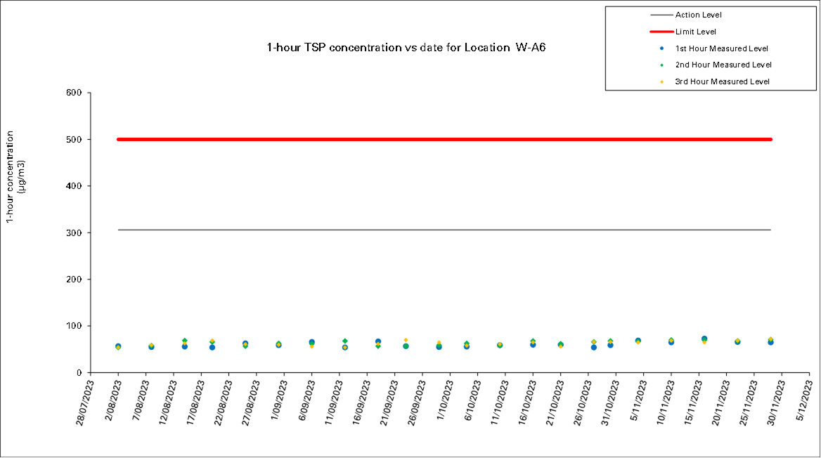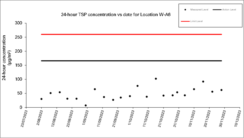 A.7 No exceedance of the Action and Limit levels of 1 hour TSP, 24 hours TSP and construction noise monitoring was recorded during the reporting month.