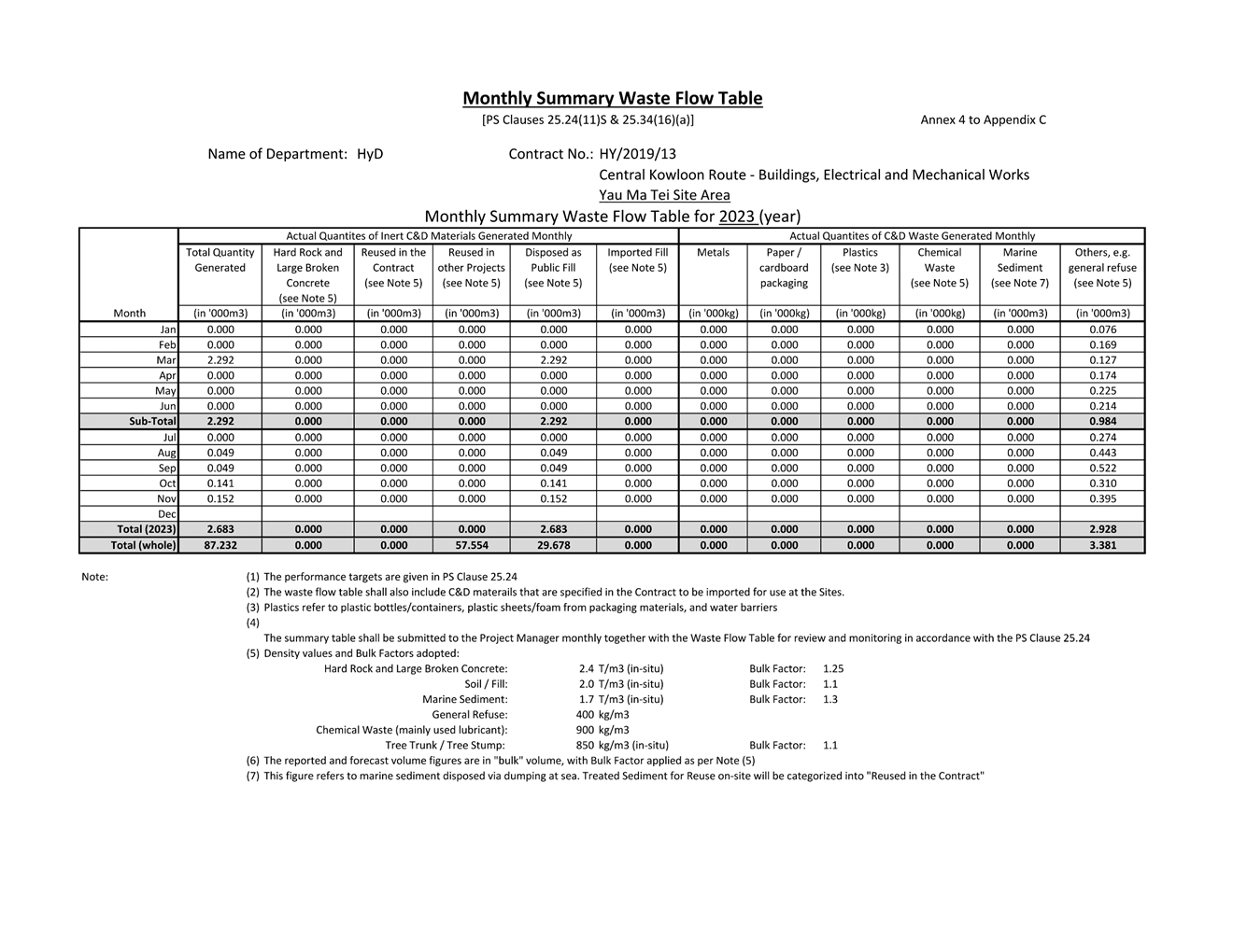 3. Site audits were carried out on a weekly basis to monitor and audit to ensure that proper storage, transportation, and disposal practices of waste materials generated during construction activities, such as construction and demolition (C&D) materials and general refuse are being implemented. The summary of site audits is shown in Table 6.1 of this report. The implementation status of the waste/chemical management measures in the reporting period are summarized in Appendix C.